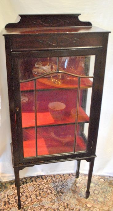 Engelsk vitrineskab med tilspidsede ben, mahogni, ca. 1900. Med udskårne blomster. Med to hylder. H: 135 cm. B.: 56 cm. D.: 27 cm.