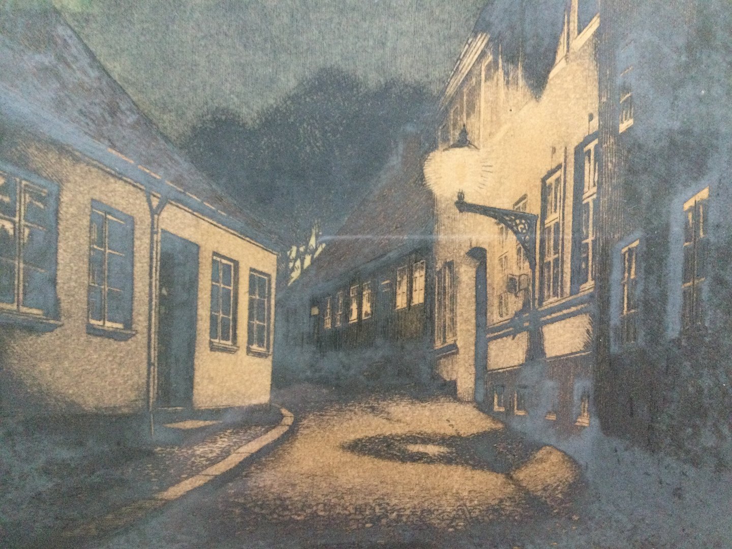 Radering af Peter Holm - Strandgade, Randers - Aften.