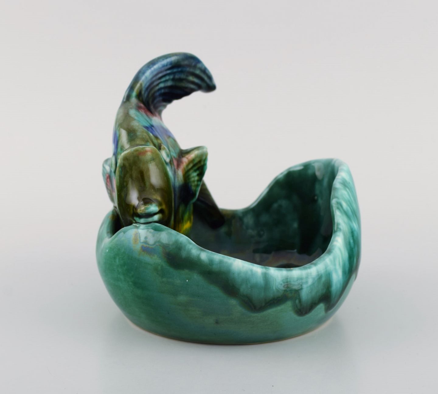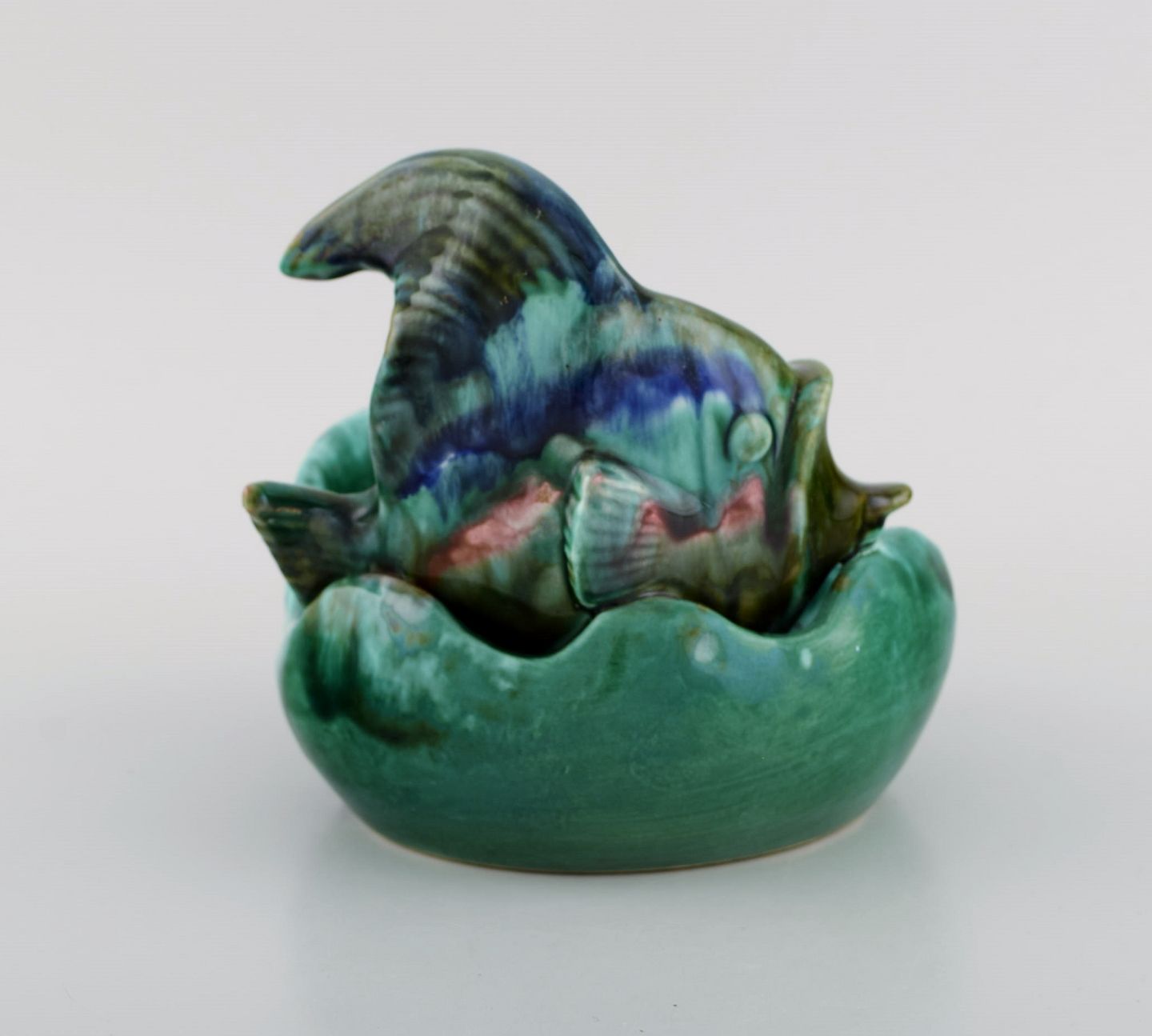 Belgisk studio keramiker. Skål i glaseret keramik modelleret med fisk. Smuk glasur i blågrønne nuancer. 1960/70'erne.