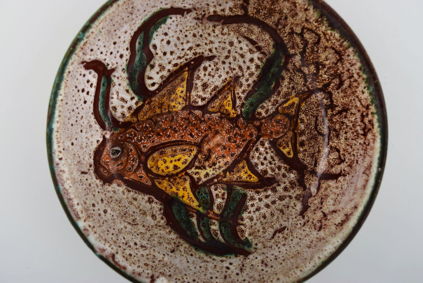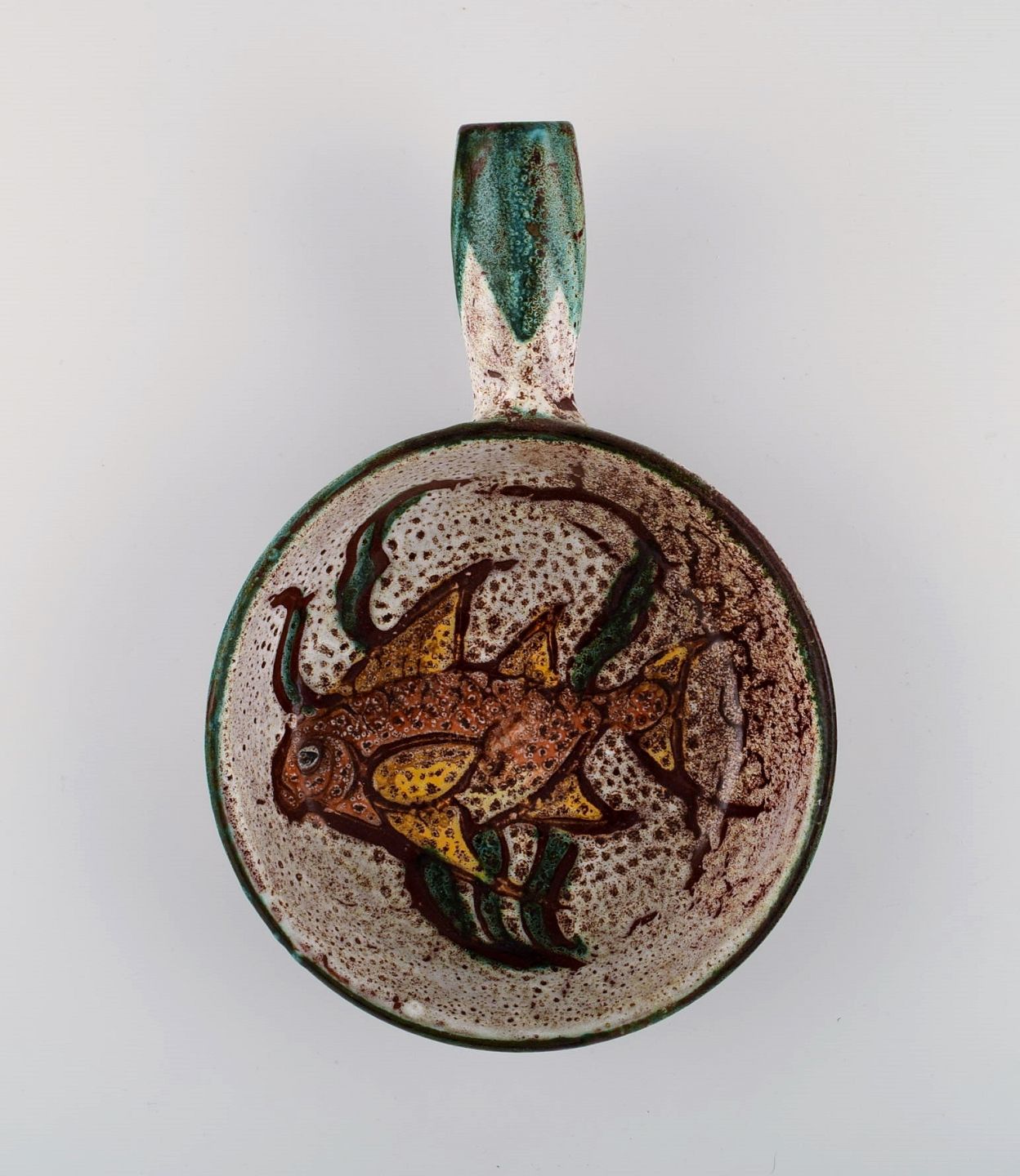 Skål, lågkrukke og tre crème brûlée skåle med hank i håndmalet glaseret stentøj. Belgien, 1960/70'erne.