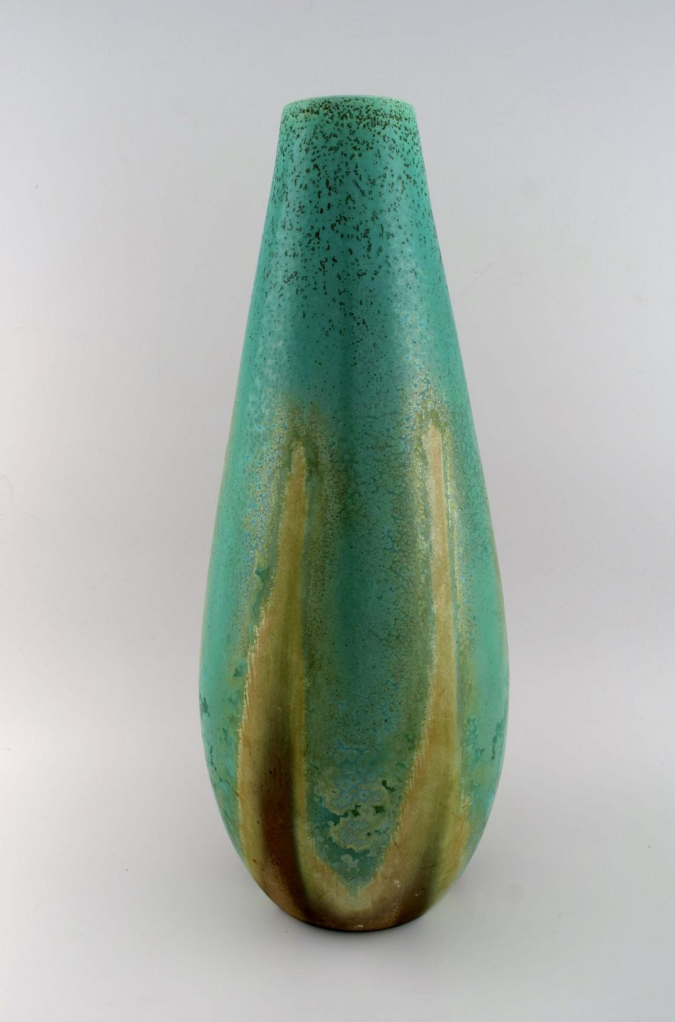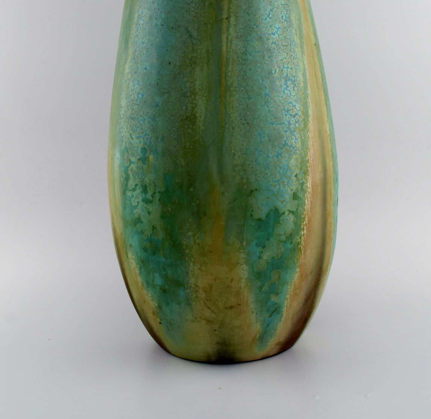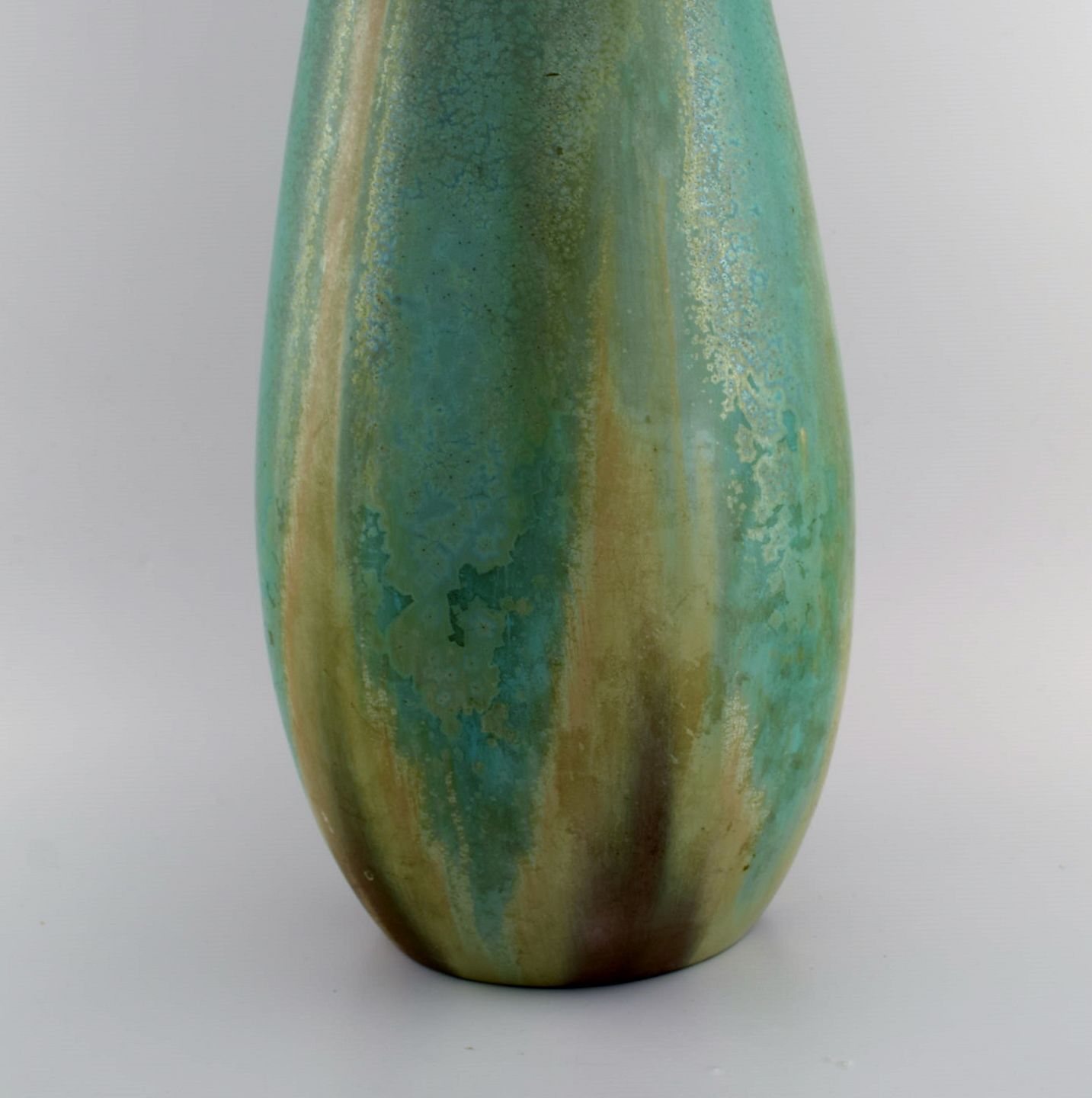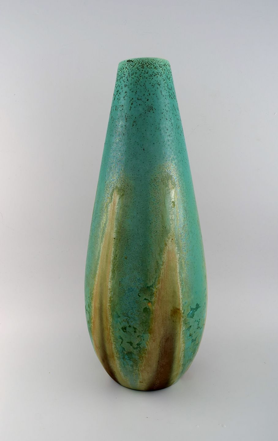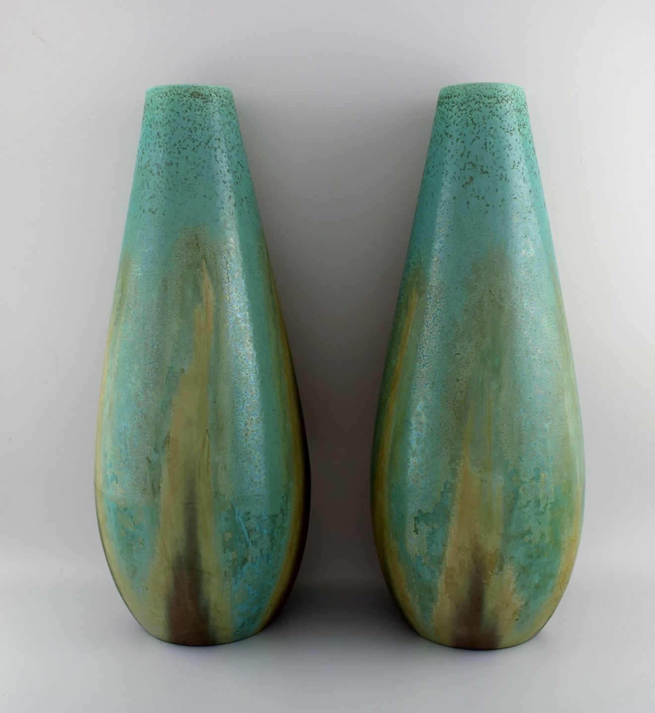 Et par kolossale franske art deco gulvvaser i glaseret keramik. Smuk glasur i turkis og lyse jordnuancer. 1940'erne.