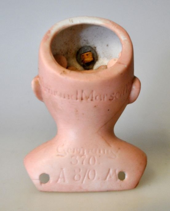 Dukkehoved i bemalet bisquit porcelæn, Armand Mareilles, Tyskland. 19. årh. Stemplet 370 A 8/0 M. Med bevægelige øjne. H.: 8,5 cm.