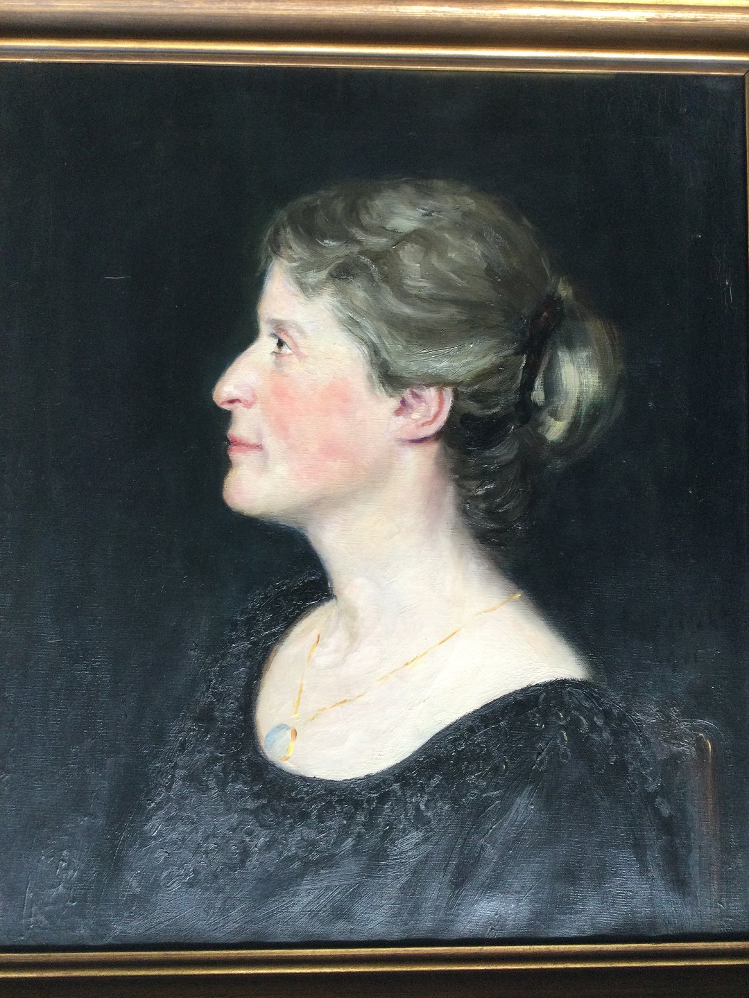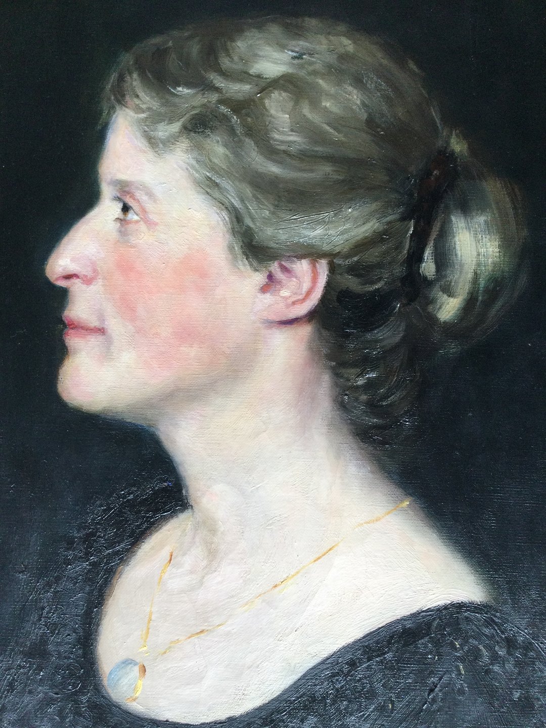 Profil portræt af ung kvinde i sort udringet kjole med rouge og guldmedaljon.