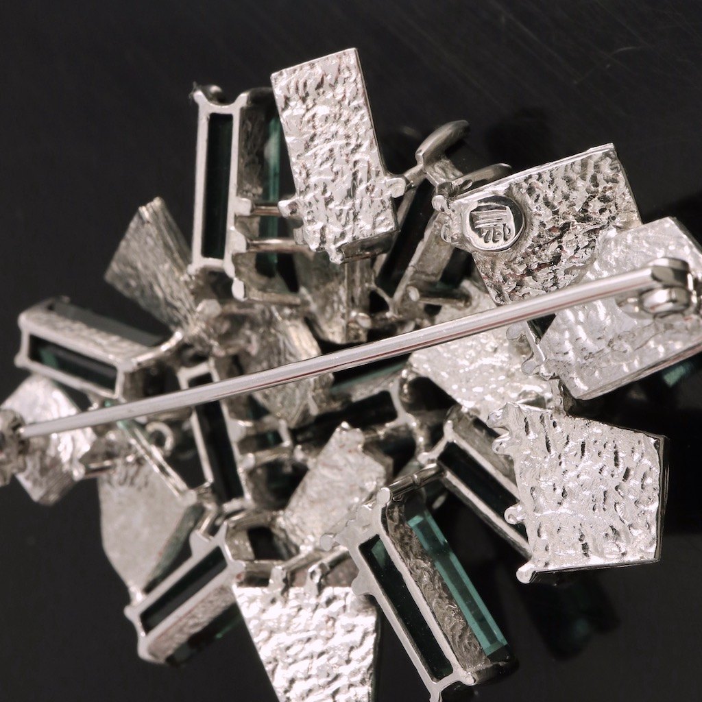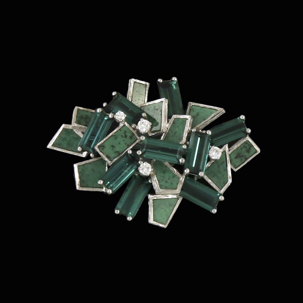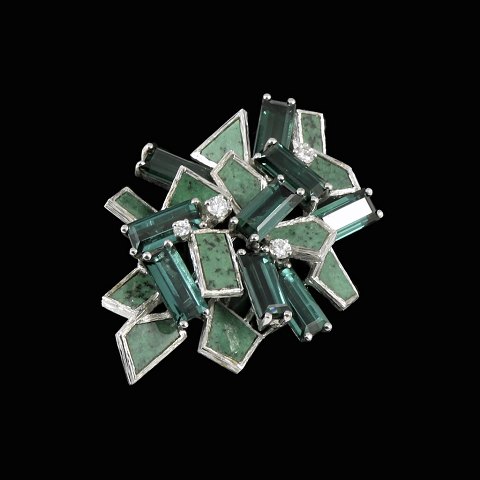 Augustin Julia-Plana. Broche i 18k hvidguld med turmalin, Nephrit og diamanter.