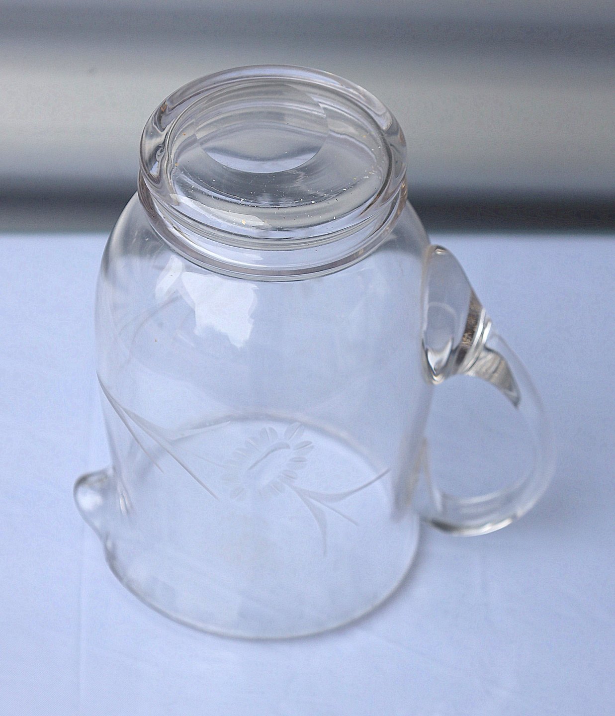 Holmegaard Glasværk. Kanden er slebet med blomster og blade, der er også små slibninger i øverste kant, hanken er påsat.