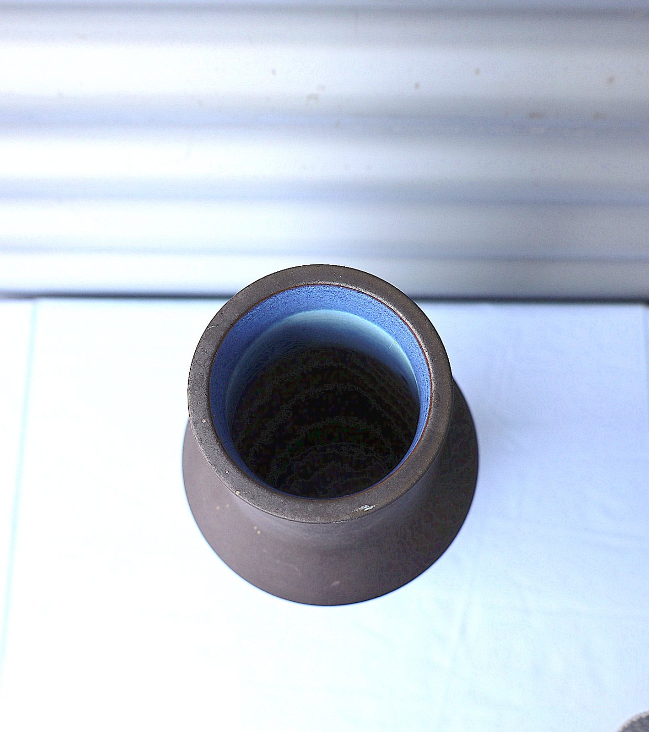 Aluminia vase nr. 3241."Thule"- vase i brunt keramik, på midten er der et geometrisk mønster i lyseblåt og hvidt. Vasen er glaseret blå indvendig.