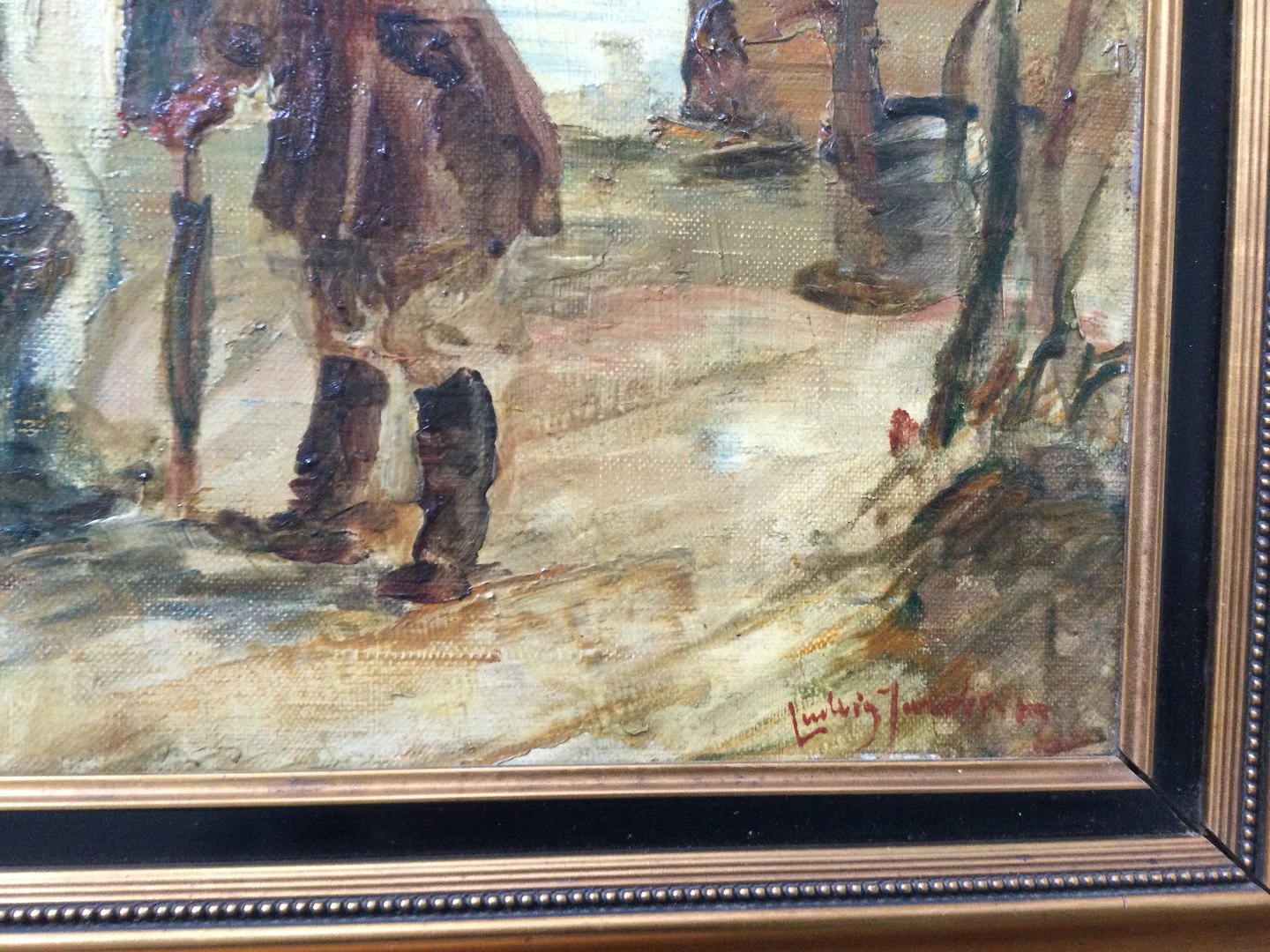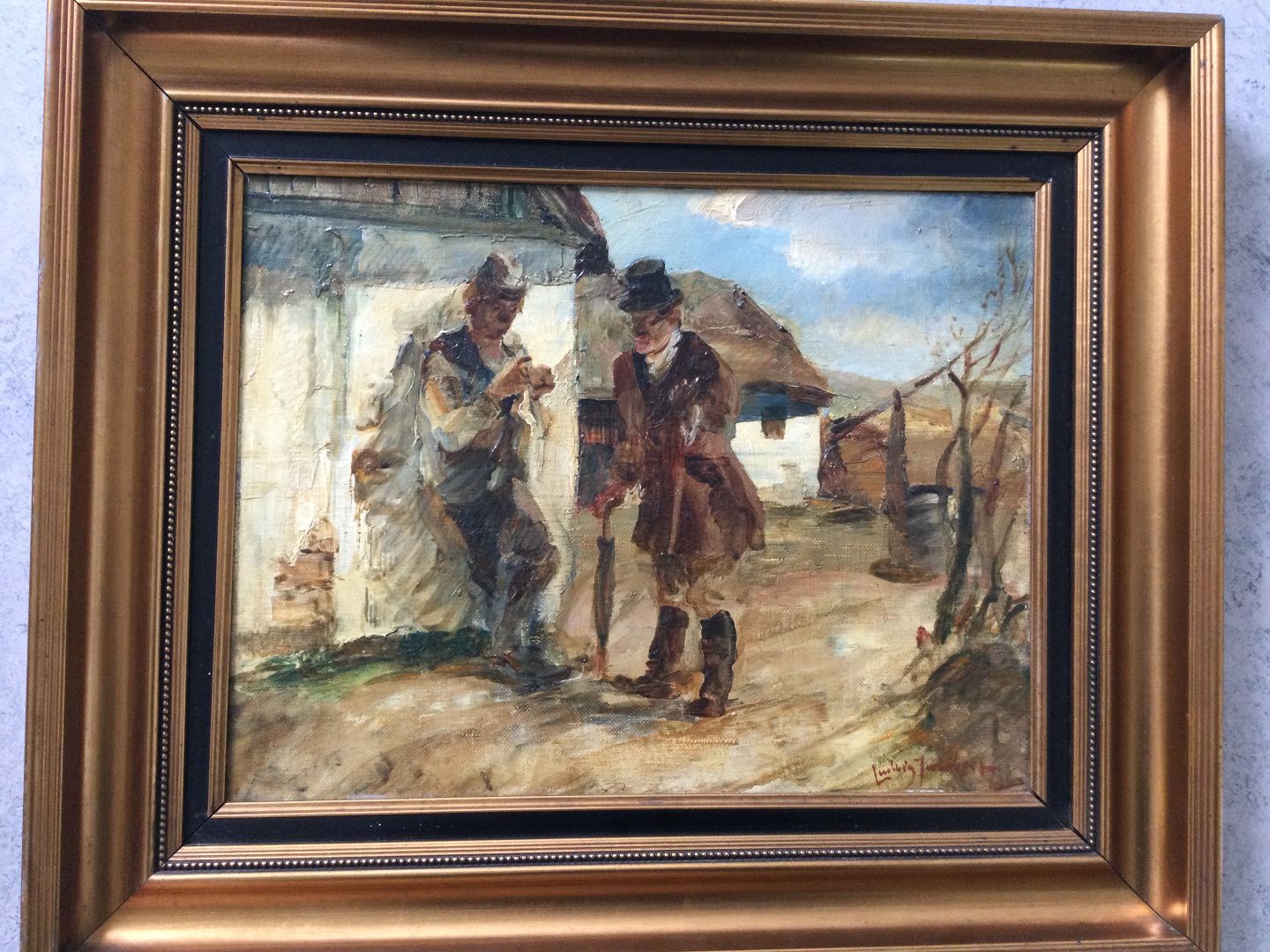 Maleri af Ludvig Jacobsen - Gårdeksteriør med 2 mænd i samtale.
