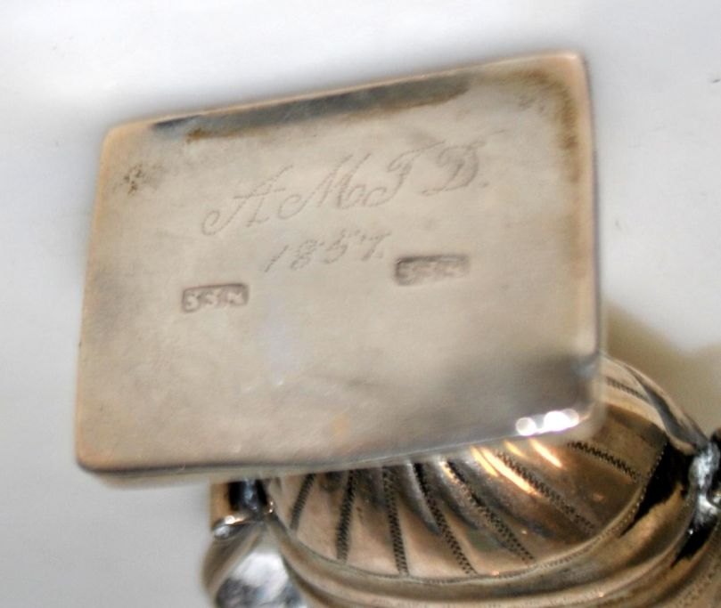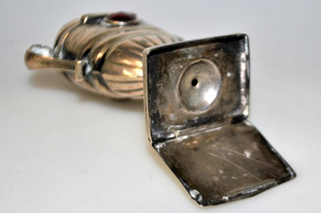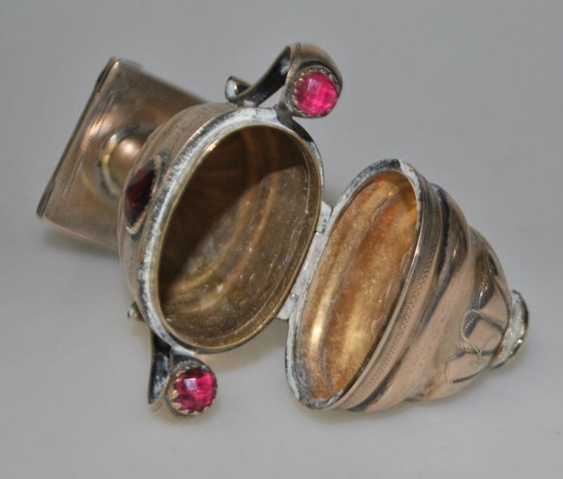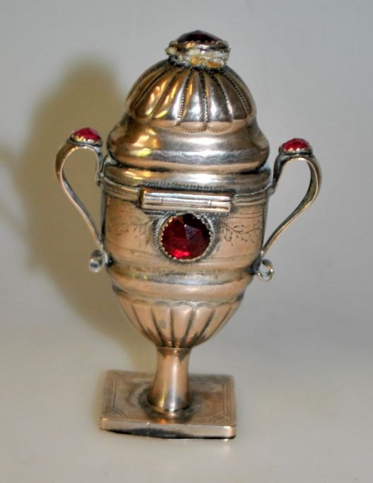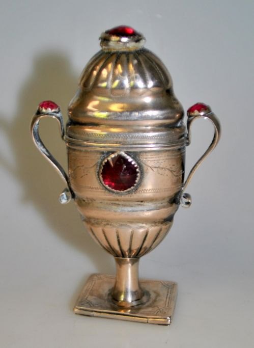 Vaseformet Louis XVI hovedvandsæg i sølv med røde glasflusser, 1857, Niels Schouw Svendsen (o. 1813 - 1891) Hobro. Med to hanke, 5 glas flusser, balsamgemme og indvendig lueforgyldning..Stemplet. I bunden inskription: A..M.F.D 1857. H.: 10 cm.
