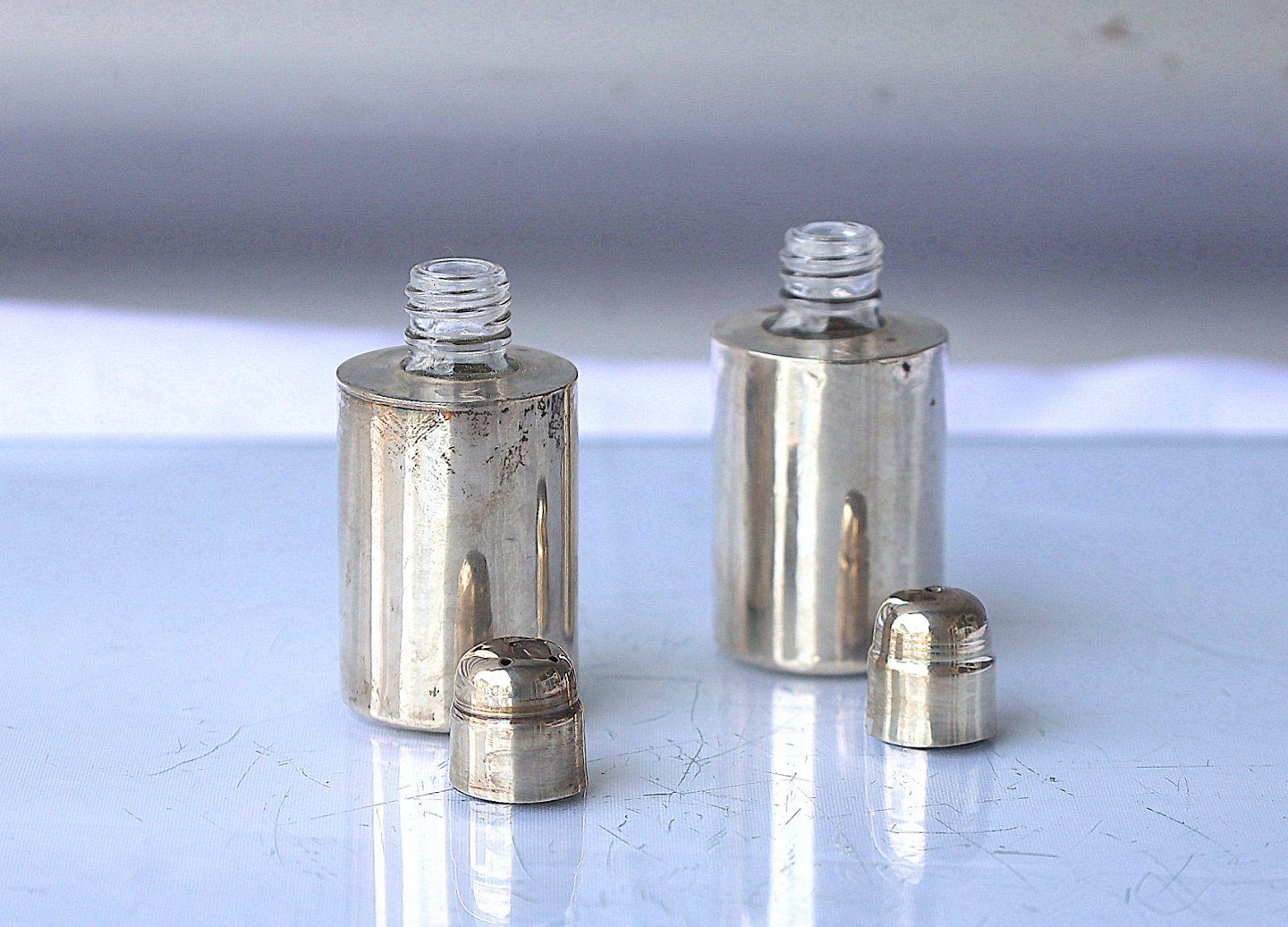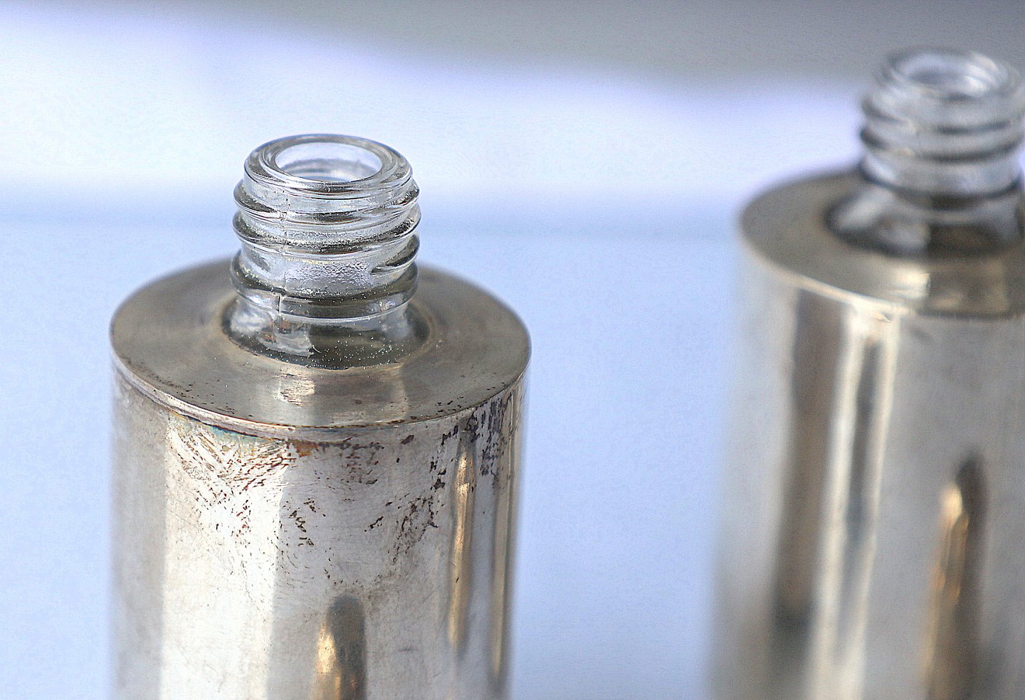 Sæt med to sølvbelagte glasflasker med skruepropper