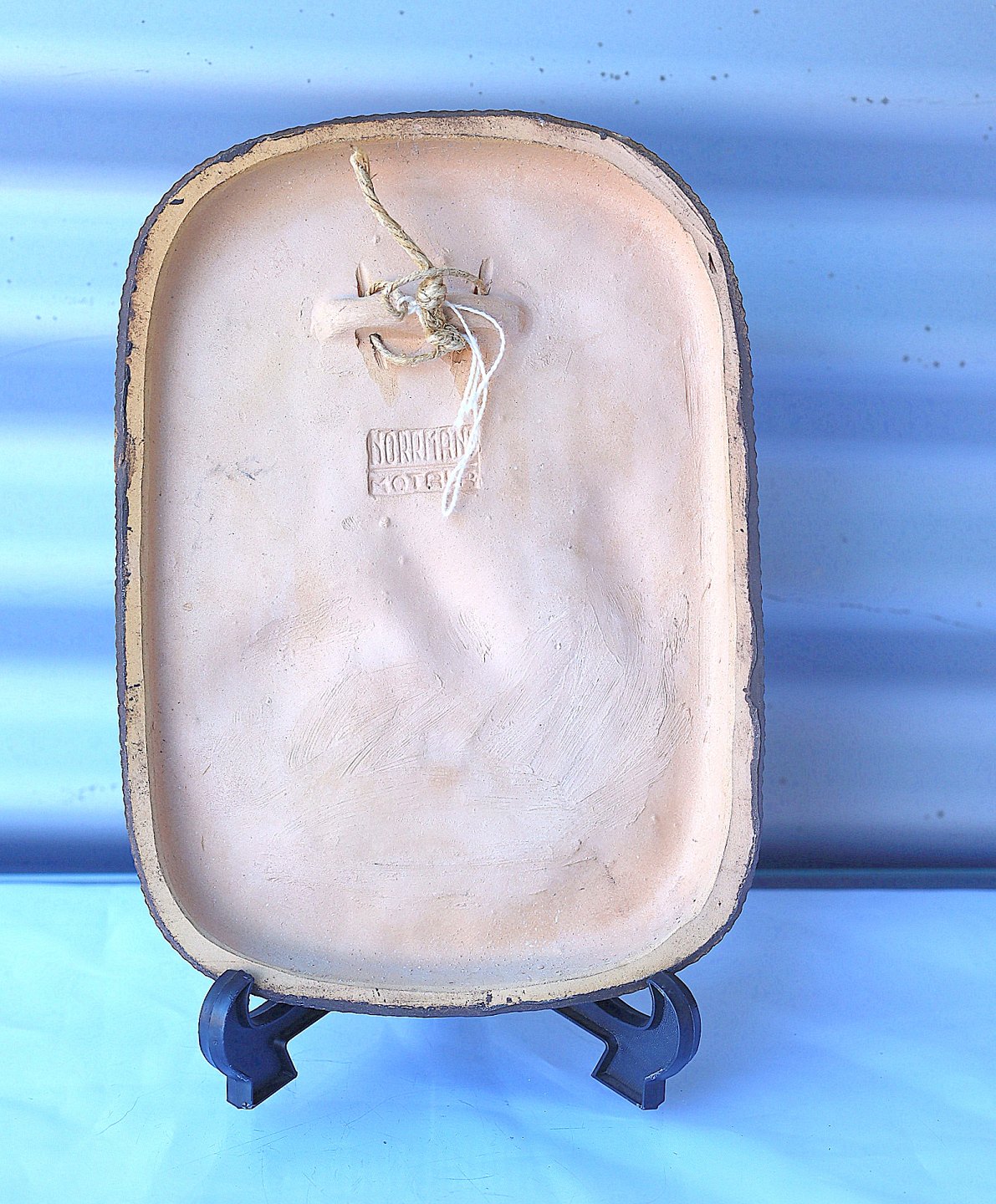 Norrmans Motala relief. Relieffet er af rødler og med hvid glasur, motivet på relieffet er 4 traner i forskellige positurer.