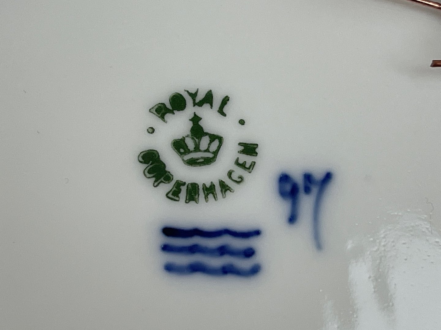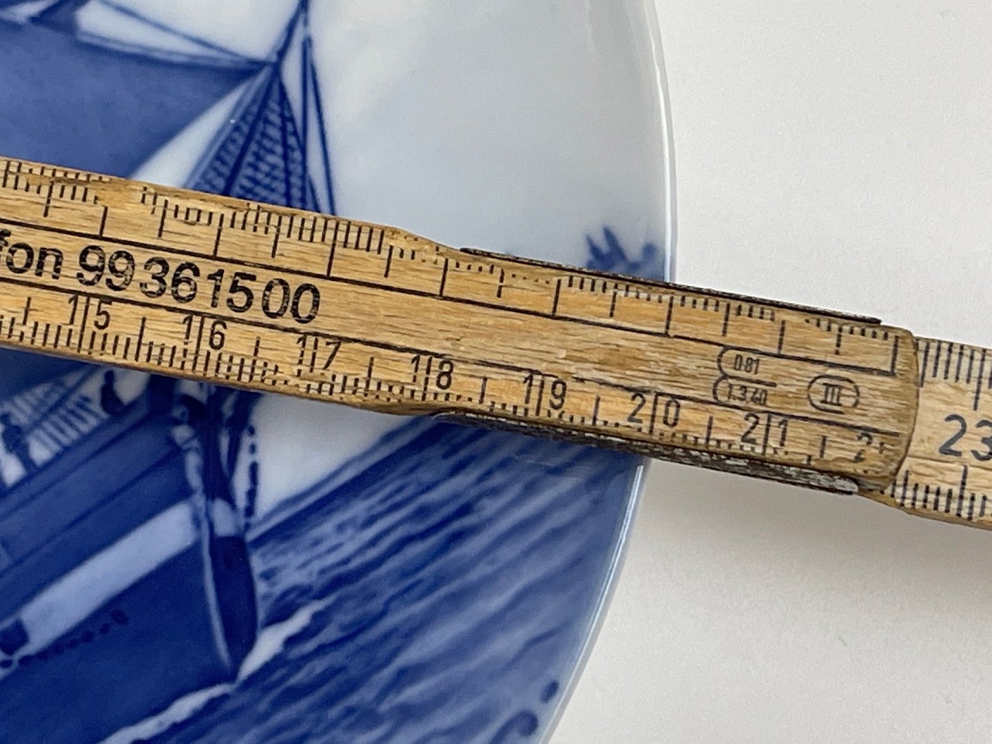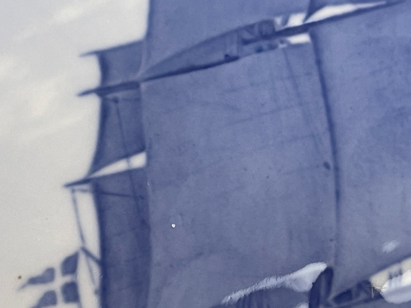 Platten er 1. sortering og i fin stand med lille glasurafstød, der ses som hvid prik på sejl i venstre side. Brændingsfejl på bagside ses som små brune pletter.