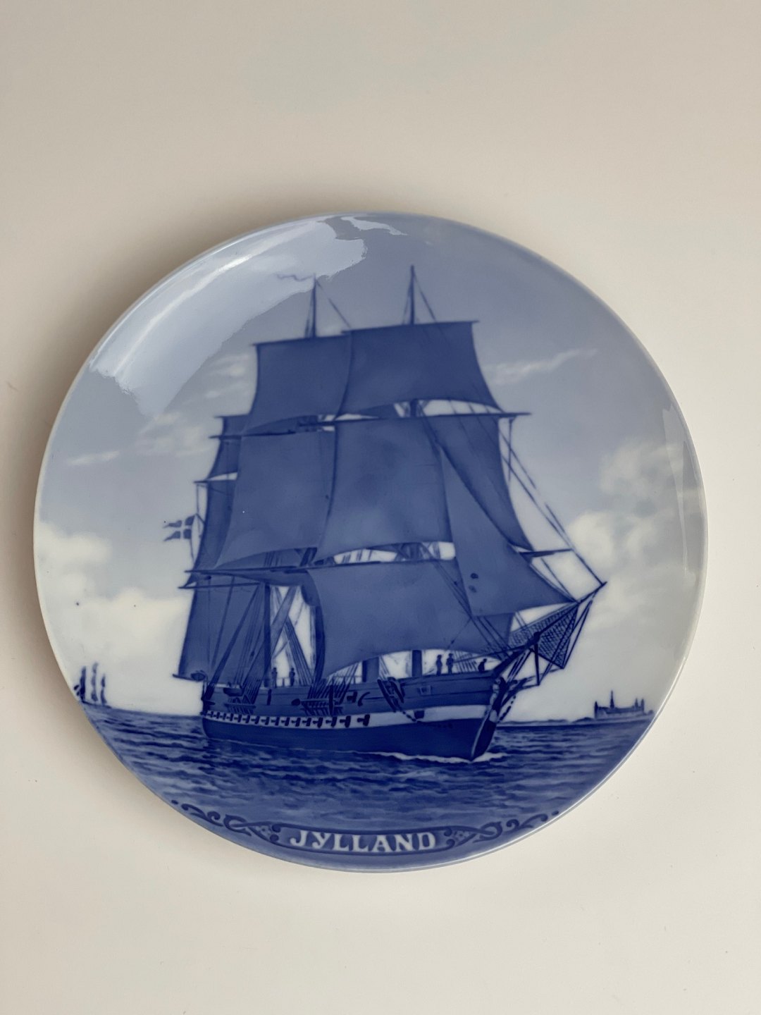 Smuk, gammel platte med motiv af Fregatten Jylland under sejlads på Øresund med Kronborg i baggrunden. Christian Blache for Den Kongelige Porcelænsfabrik / Royal Copenhagen i 1909.
