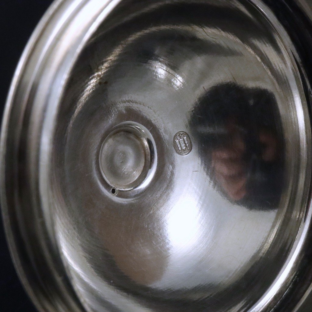 Saxbo. Krukke i stentøj med låg og ske i sølv.