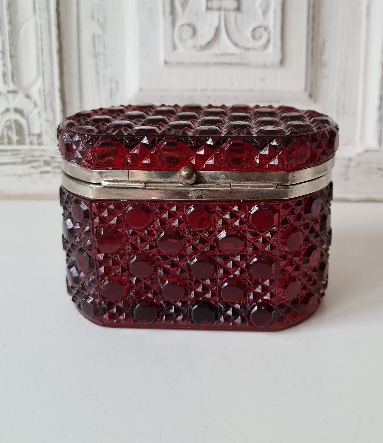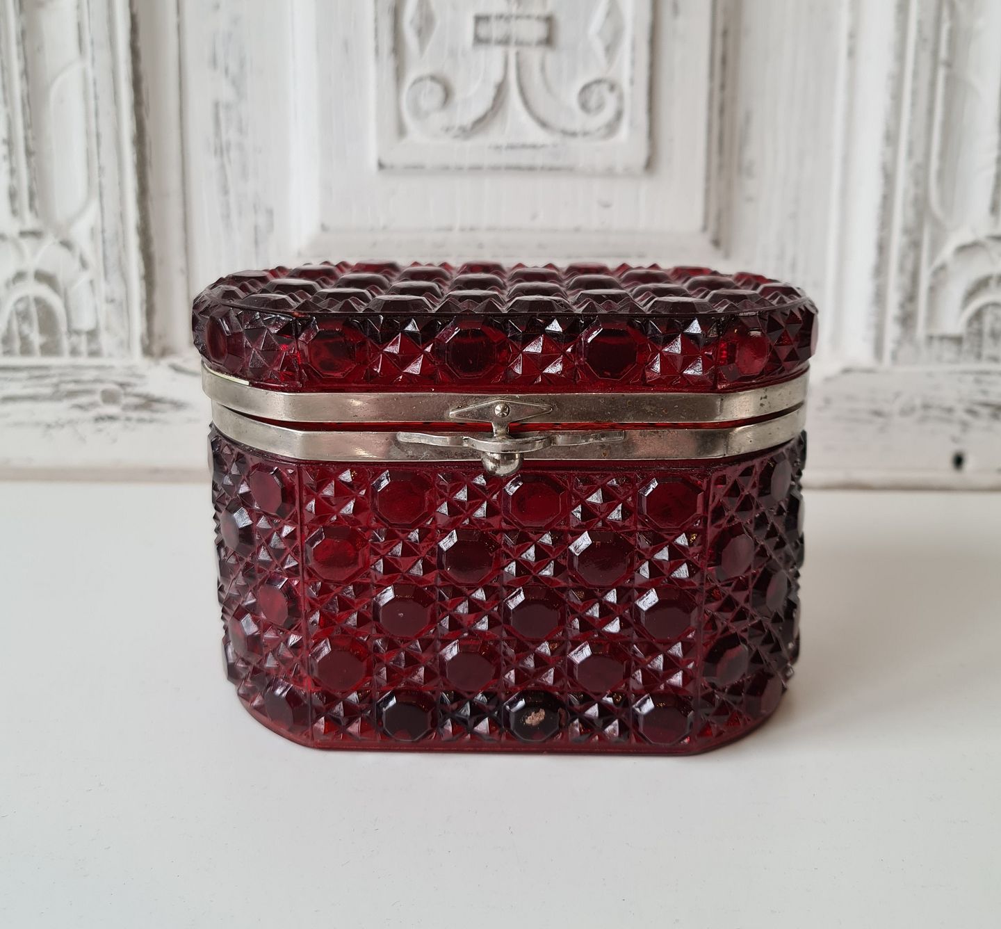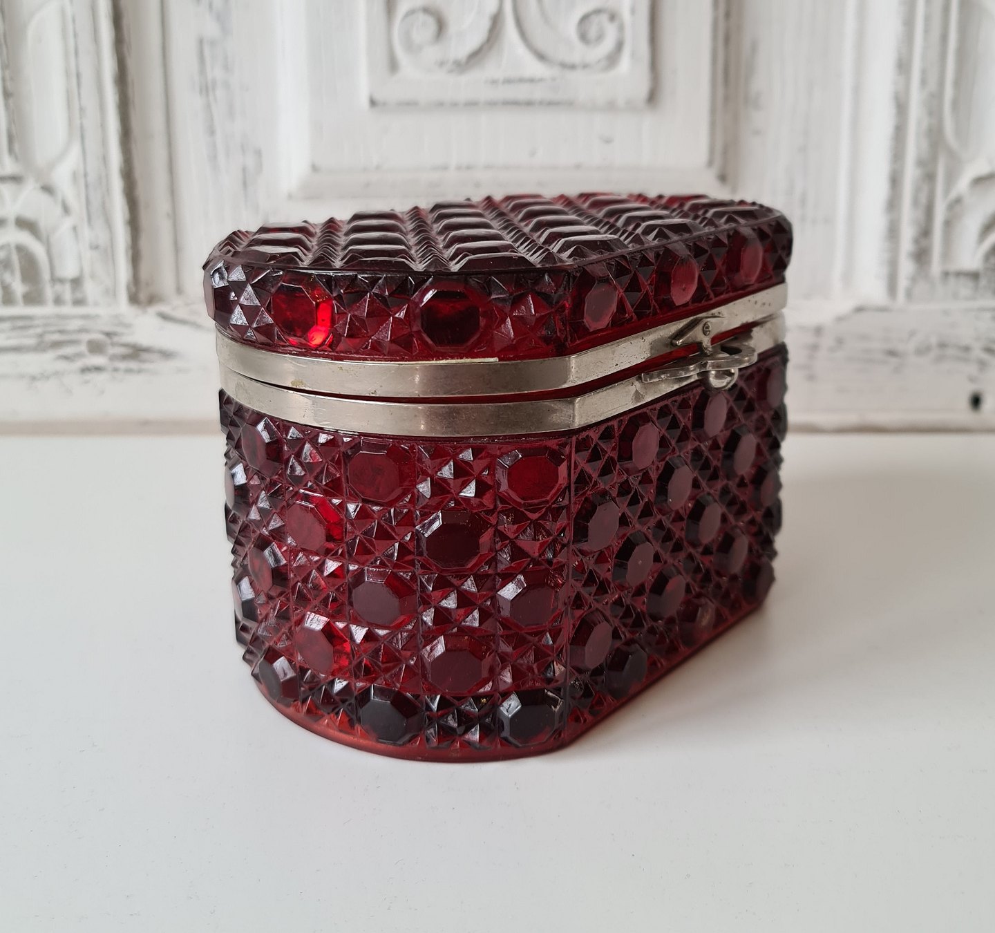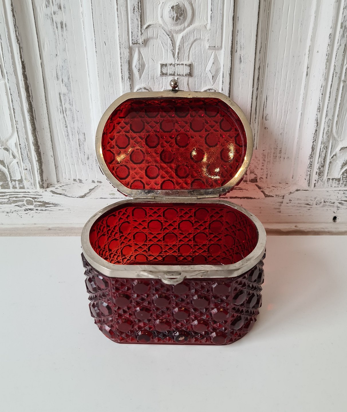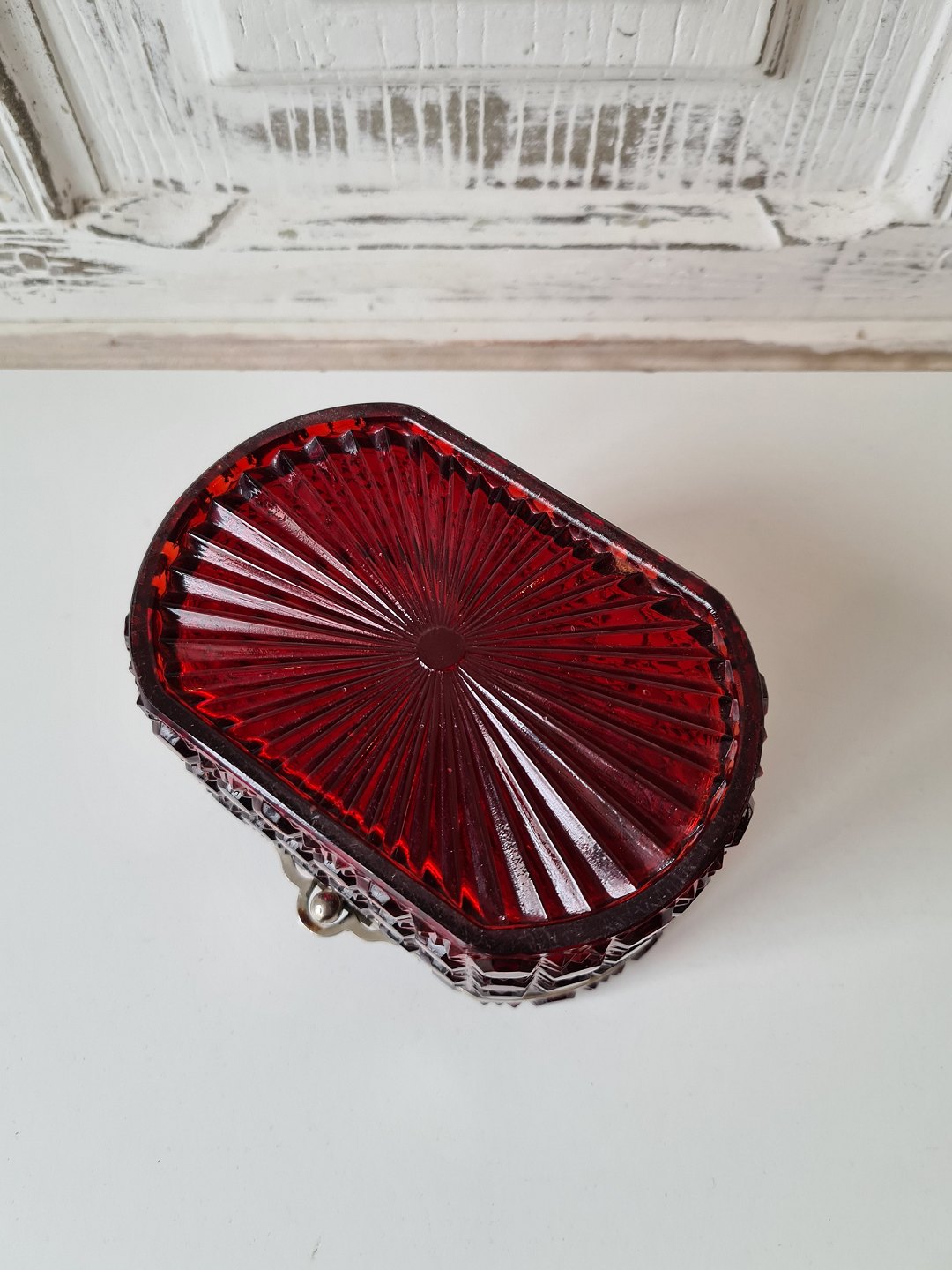 Kandisskrin i rubinrødt presset glas
