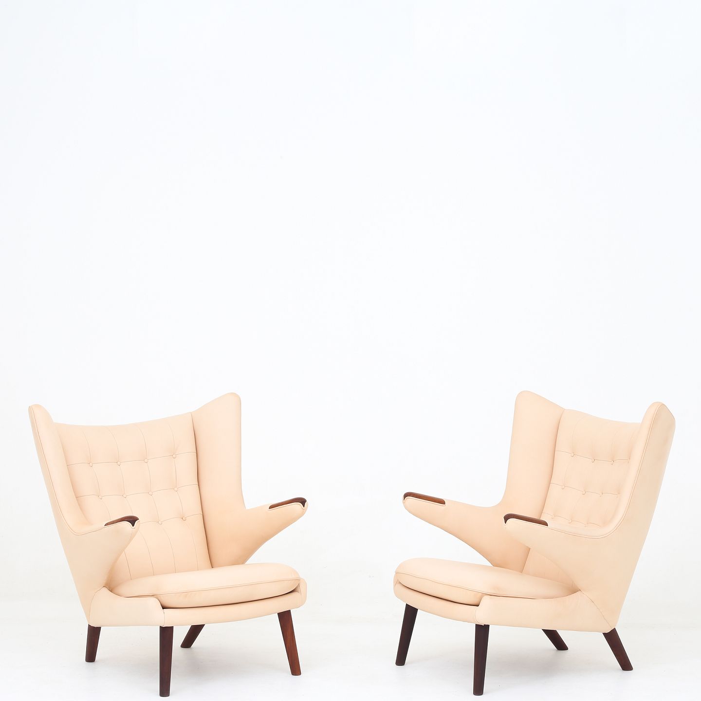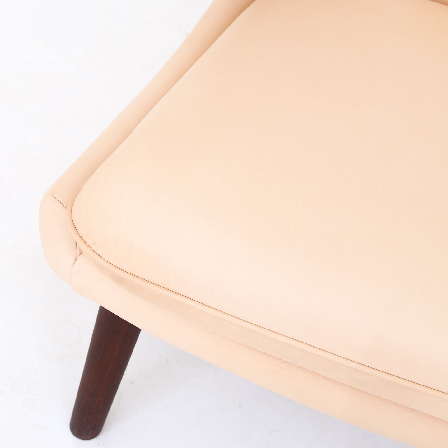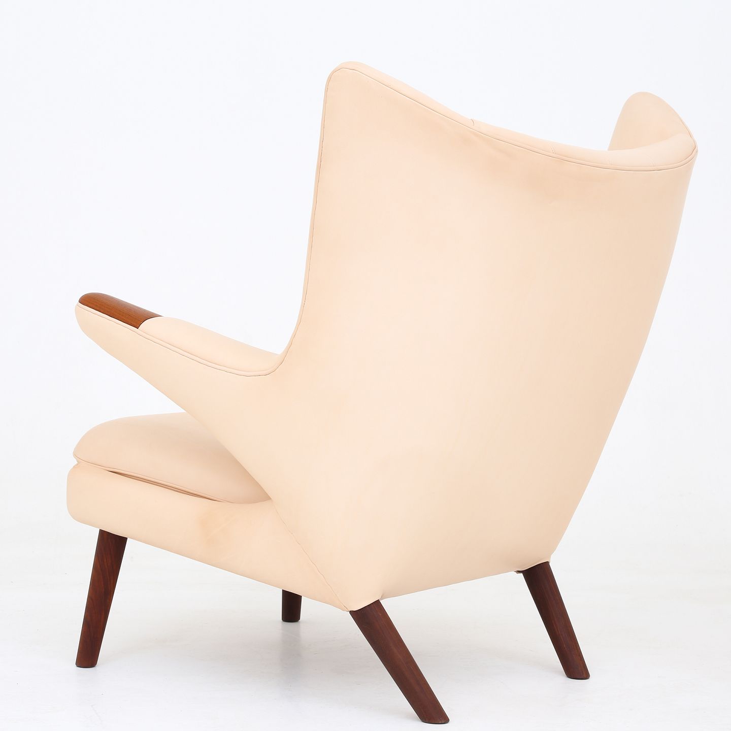 AP 19 - Nybetrukket Bamsestol i vegetal-læder/naturlæder med mørke ben og poter. KLASSIK tilbyder polstring af Bamsestolen med stof eller læder efter eget valg. Kontakt os venligst for mere information.
