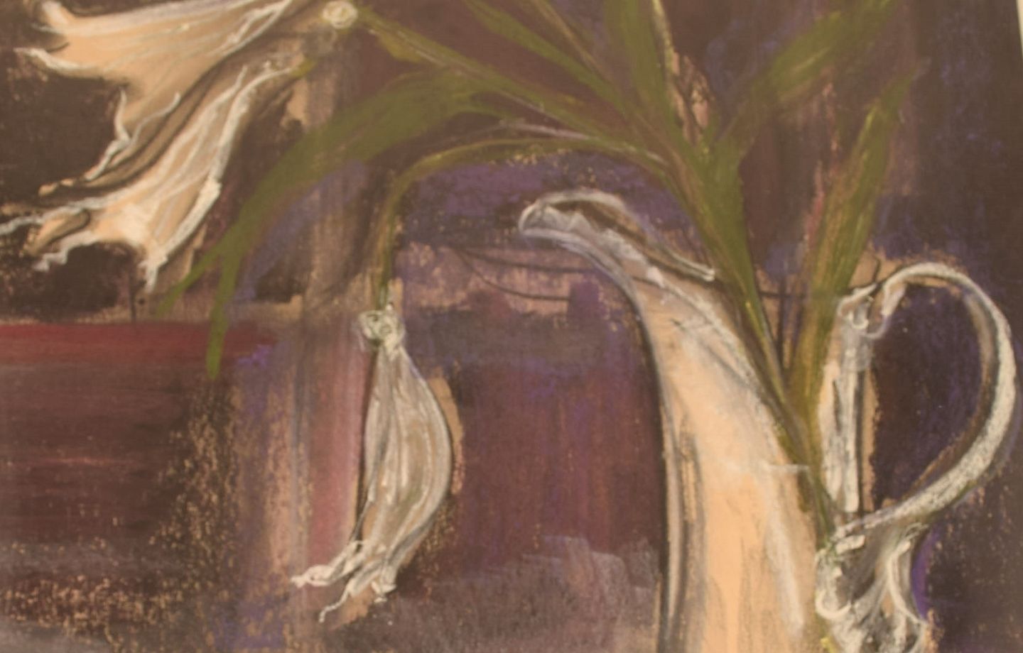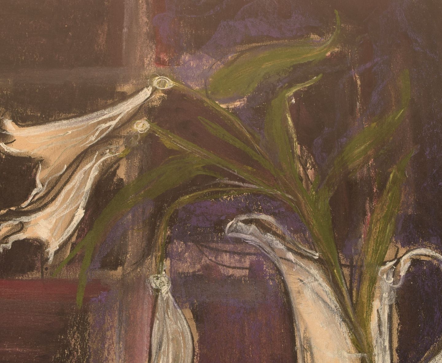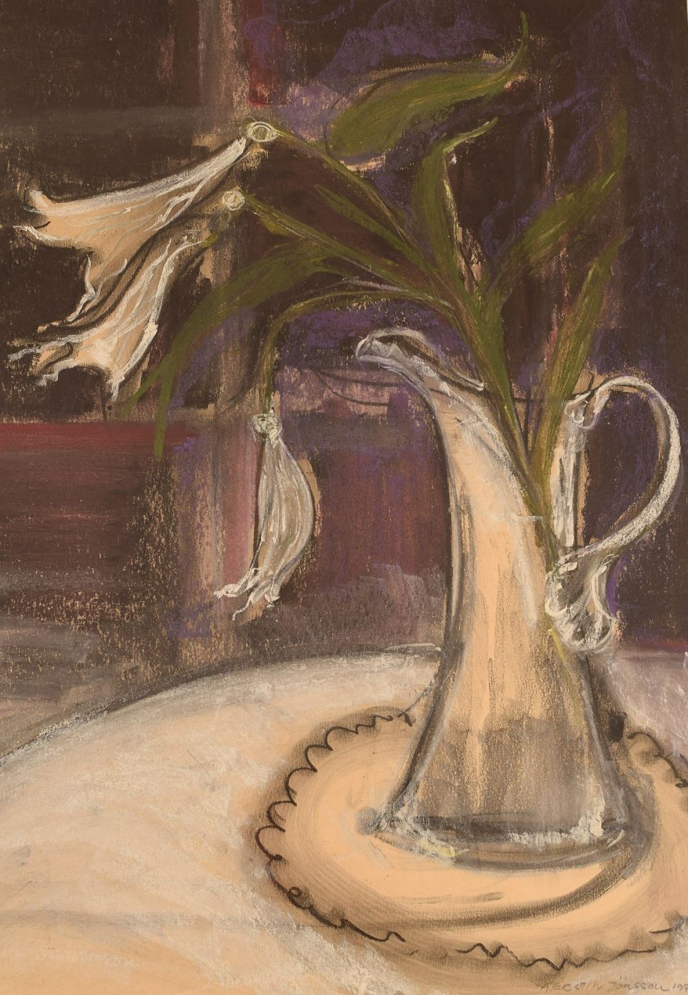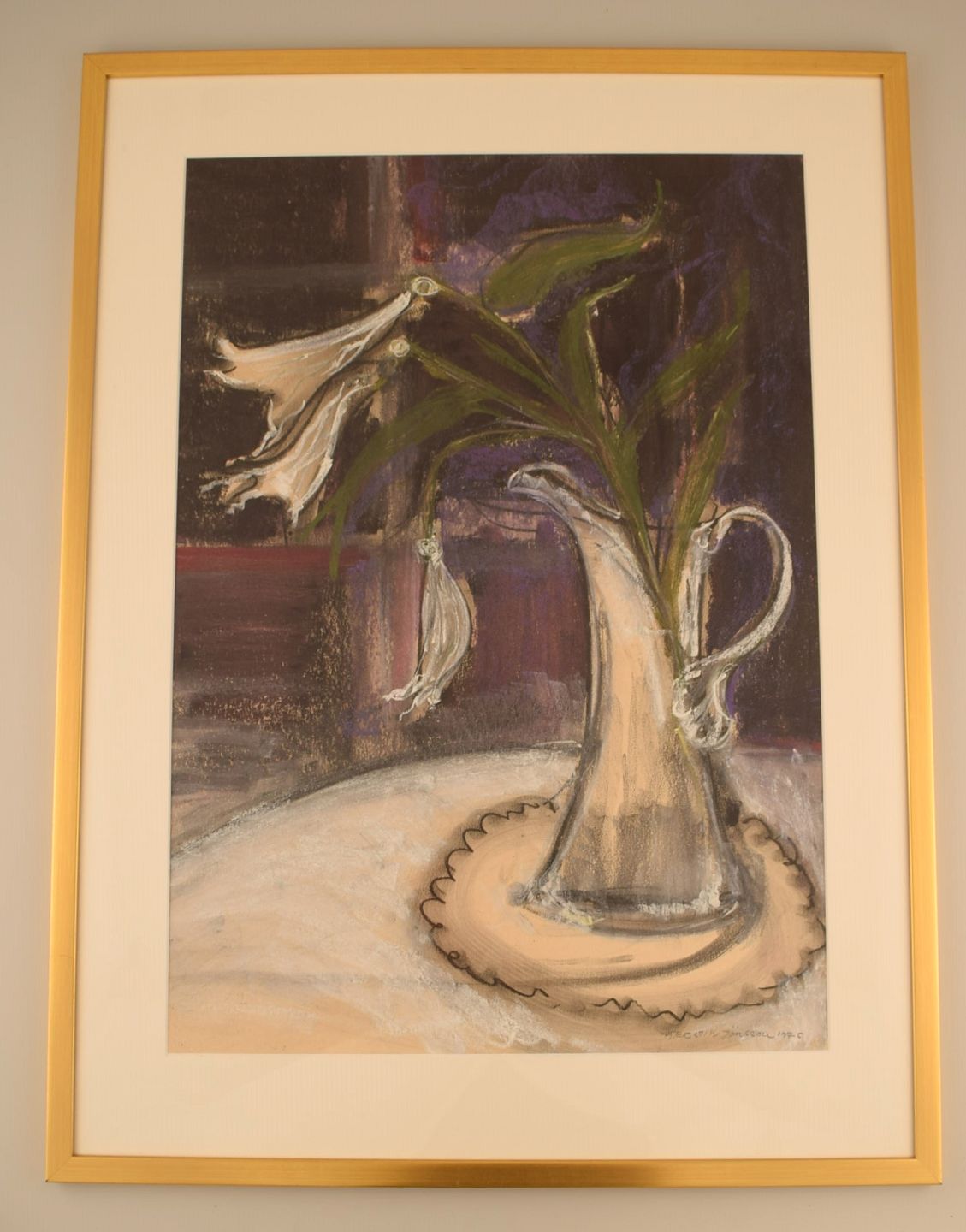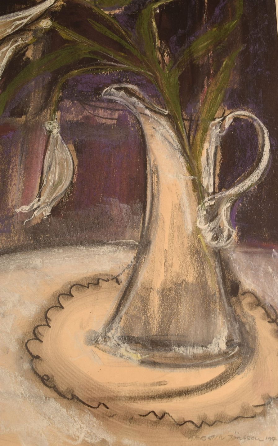 Kerstin Jönsson (1931-2000), Sverige. Pastel på papir. "Liljer i kande". Dateret 1975.