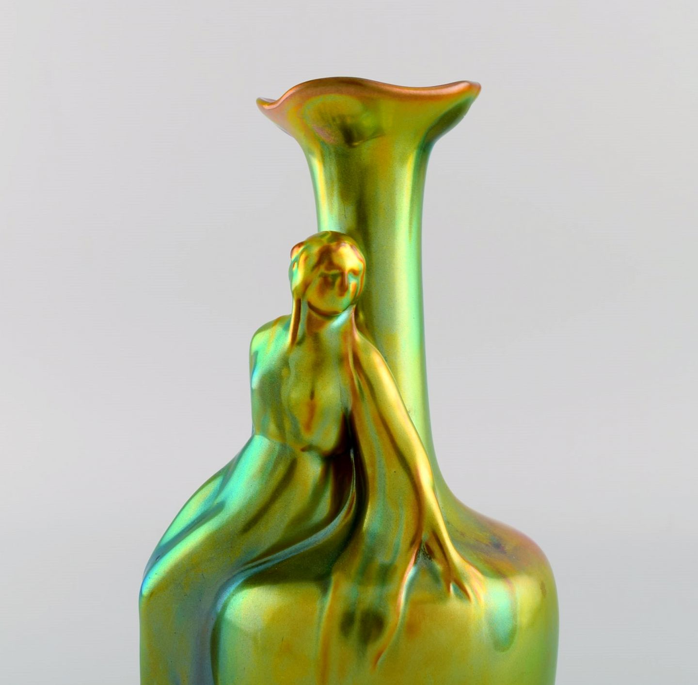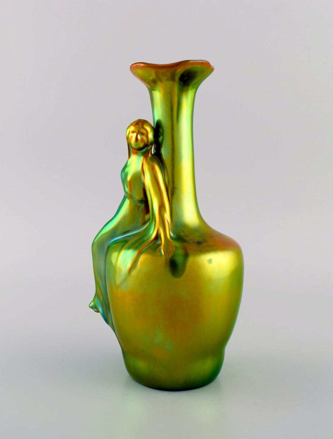 Zsolnay art nouveau vase i glaseret keramik modelleret med siddende kvinde. Smuk lustreglasur. 1920/30'erne.