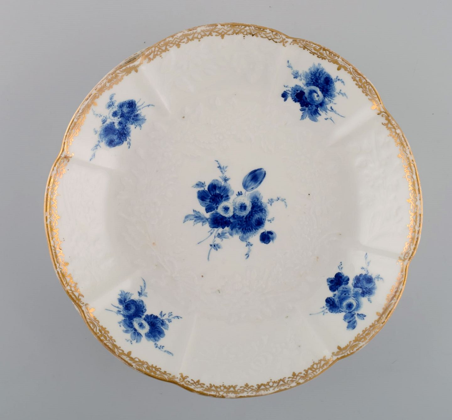 To antikke Meissen dybe tallerkener med bladværk i relief, håndmalede blomster og guldkant. Dateret 1732-1773.