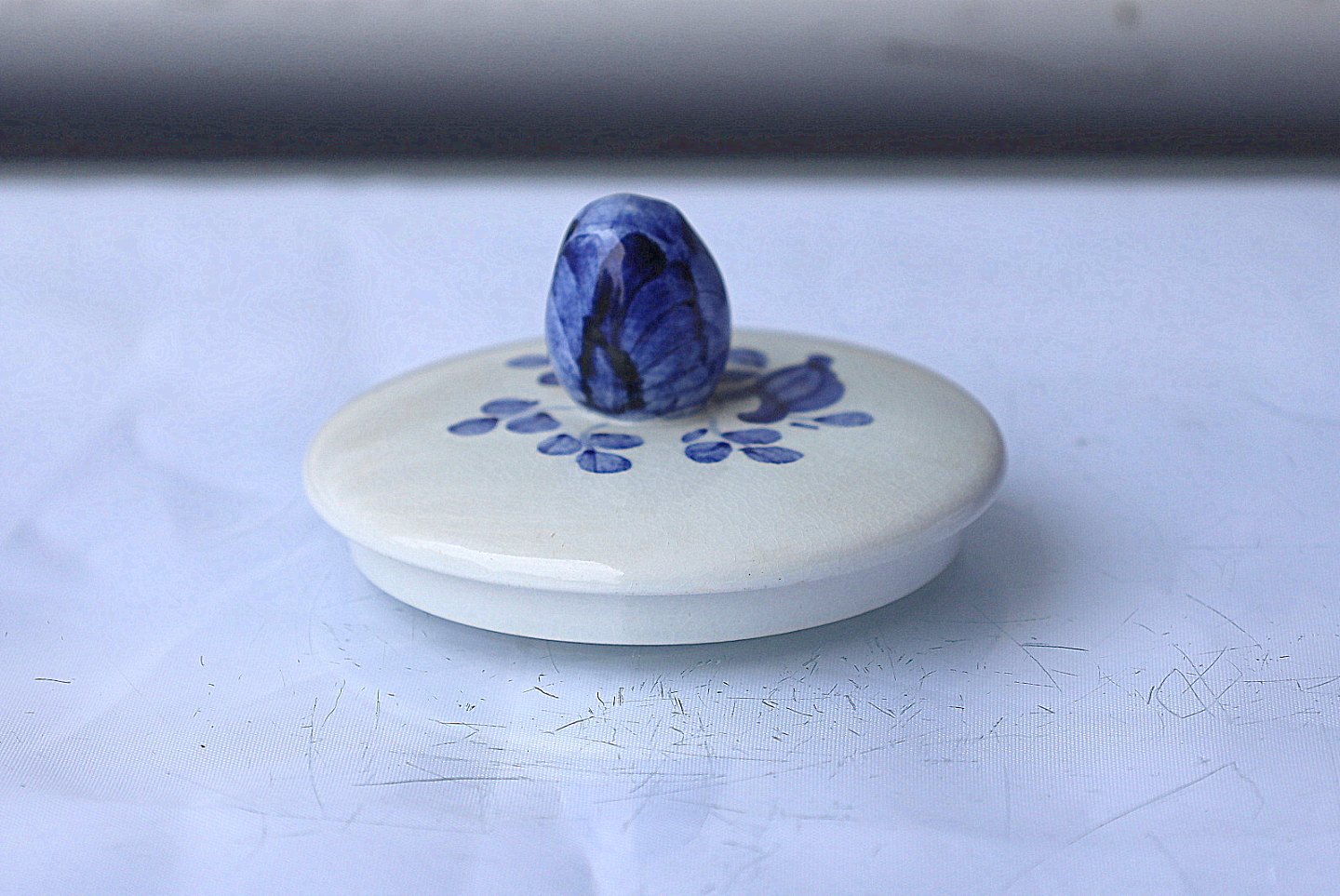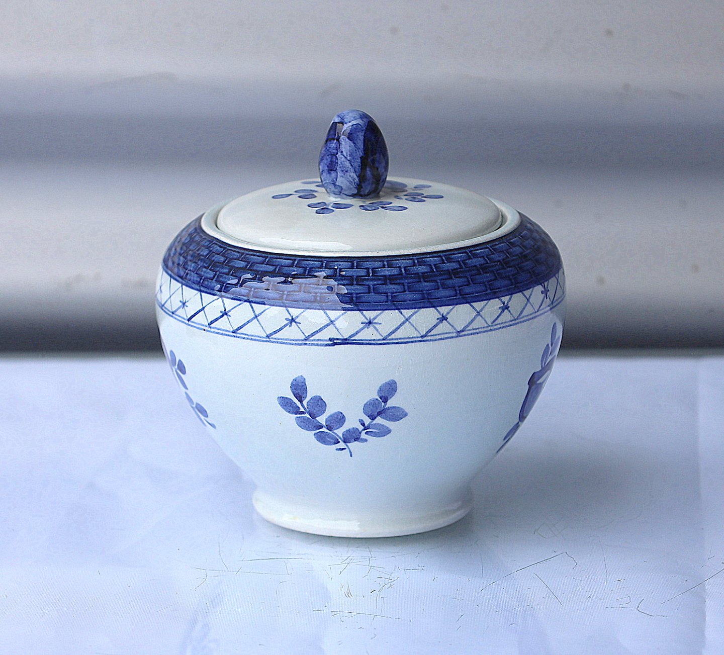 Aluminia Tranquebar, sukkerskål nr. 11/1132. Sukkerskål med låg, med blå dekoration, sukkerskålen er af fajance.