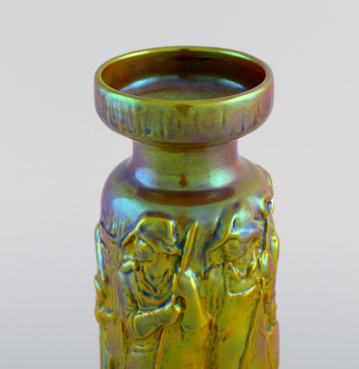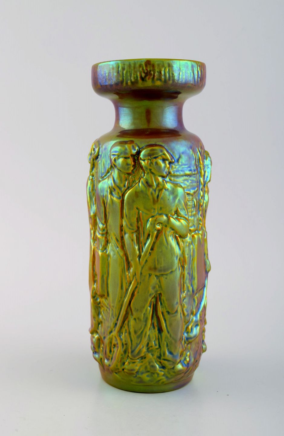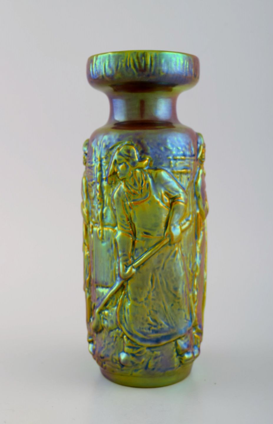 Art deco Zsolnay vase i glaseret keramik modelleret med arbejdere. Smuk lustreglasur. 1920/30'erne.