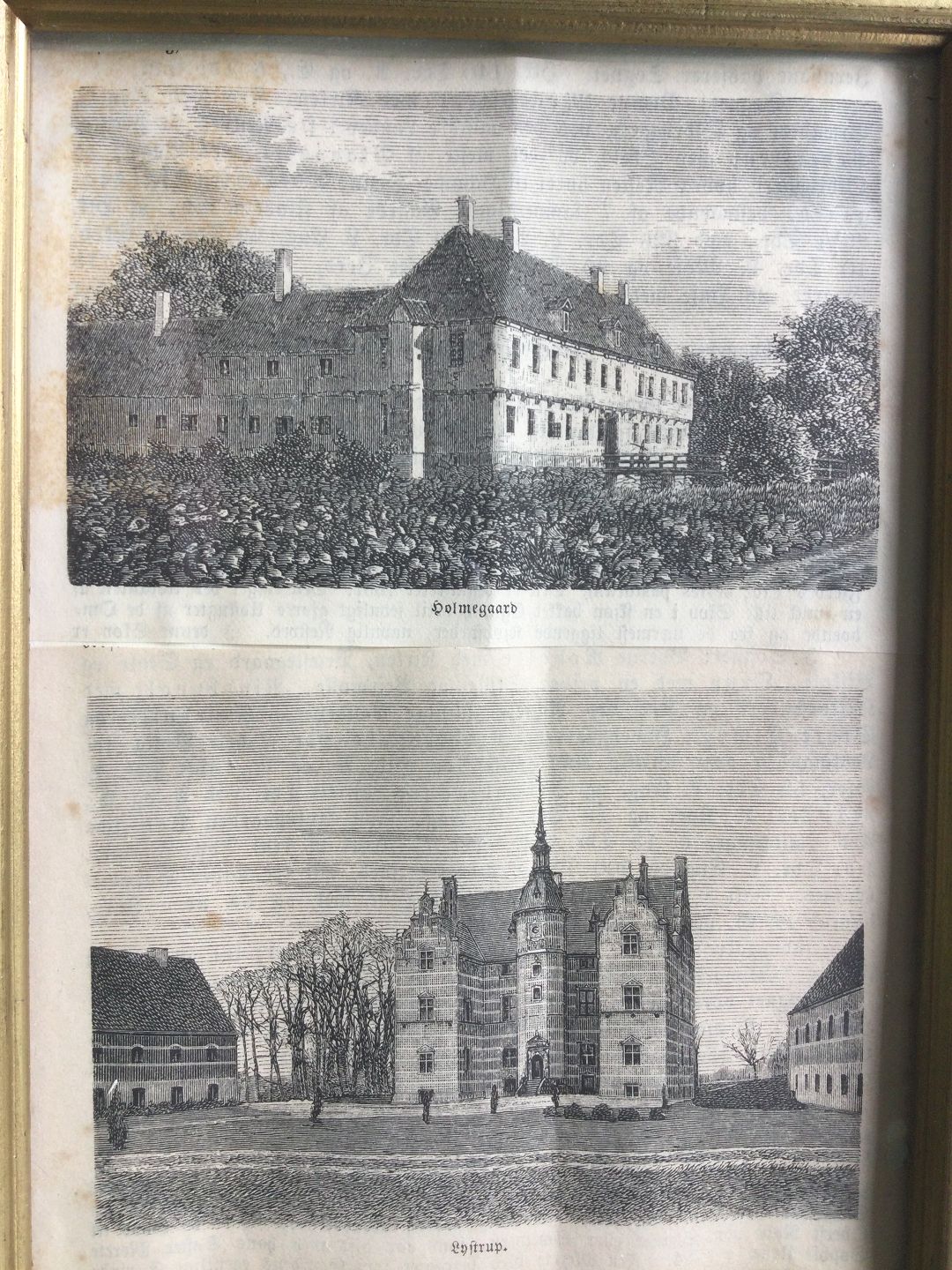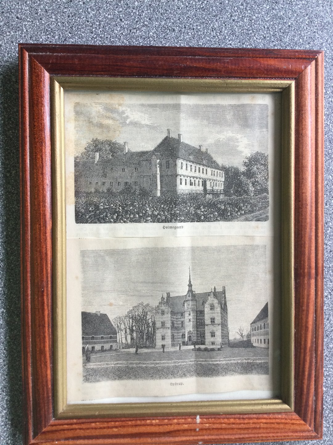 2 små xylografier i samme ramme Holmegaard og Lystrup Slot.