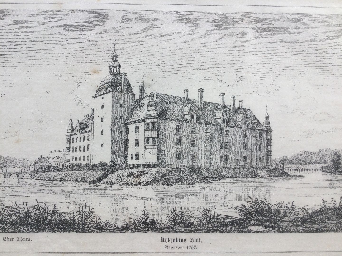 Text available in Danish: Litografi - Nykøbing Slot 1749 efter Den Danske Vitruvius.