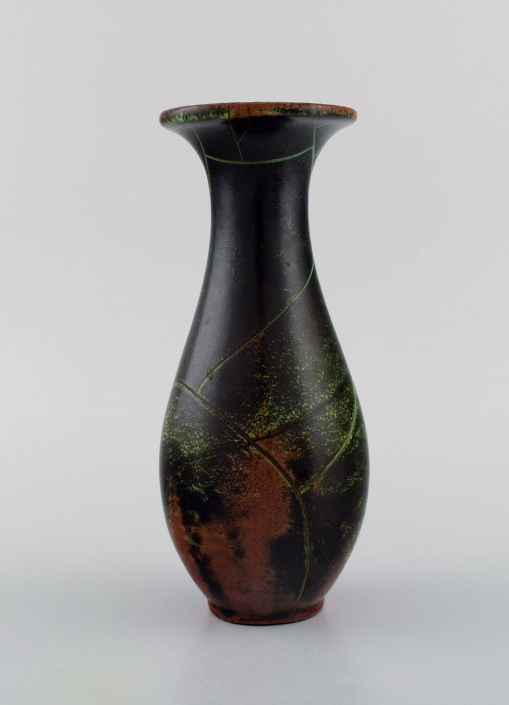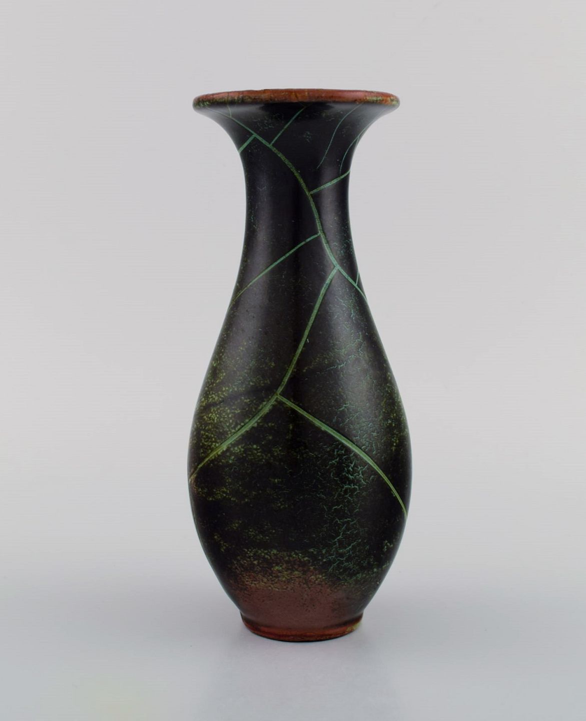 Paul Dressler for Grotenburg, Germany. Two vases in glazed stoneware. Beautiful crackle glaze in shades of red and green. 1940s.