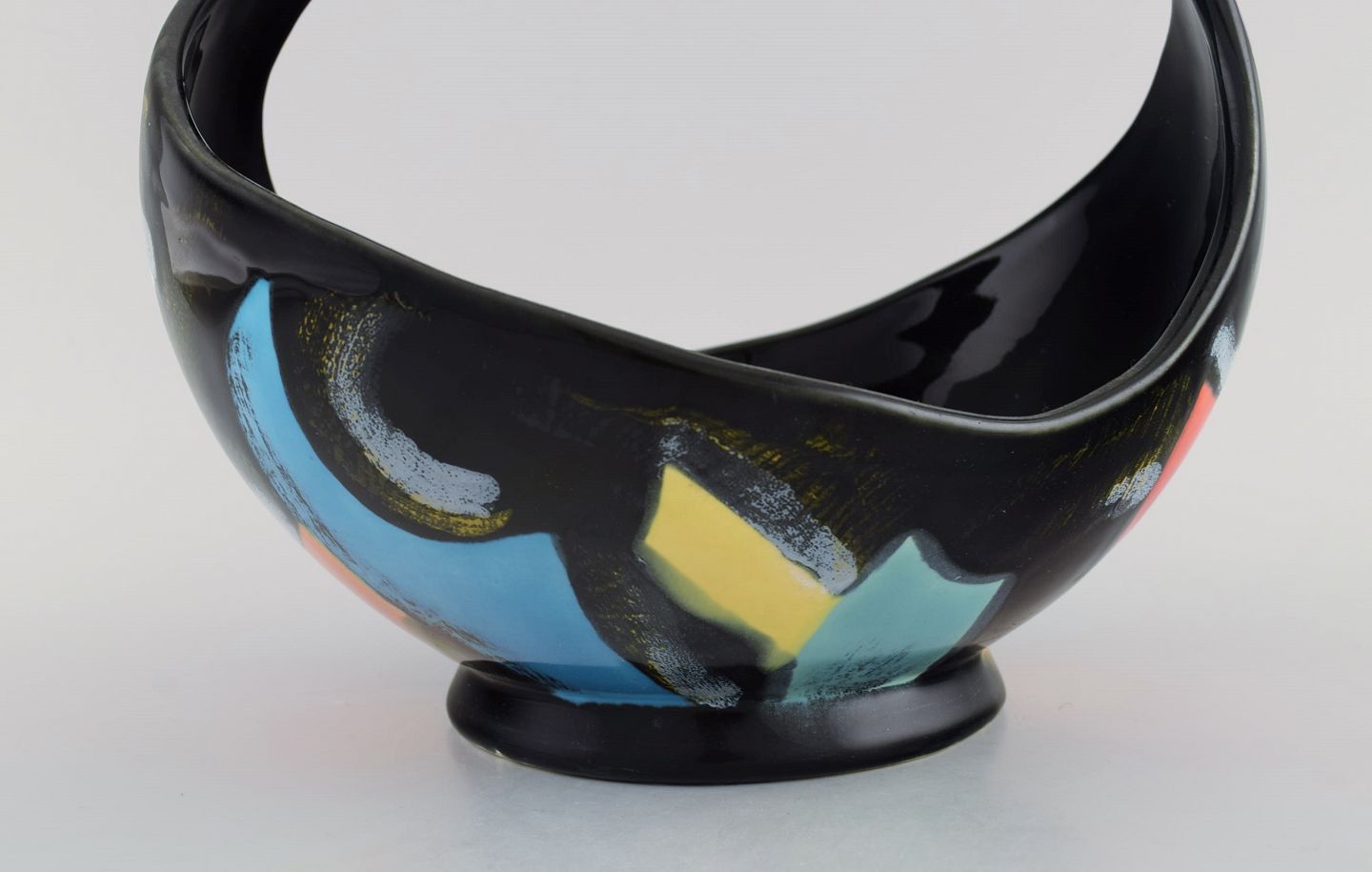 Longwy, Frankrig. Equinoxe kurv i glaseret keramik. Abstrakt polykrom dekoration på sort baggrund. Midt 1900-tallet.
