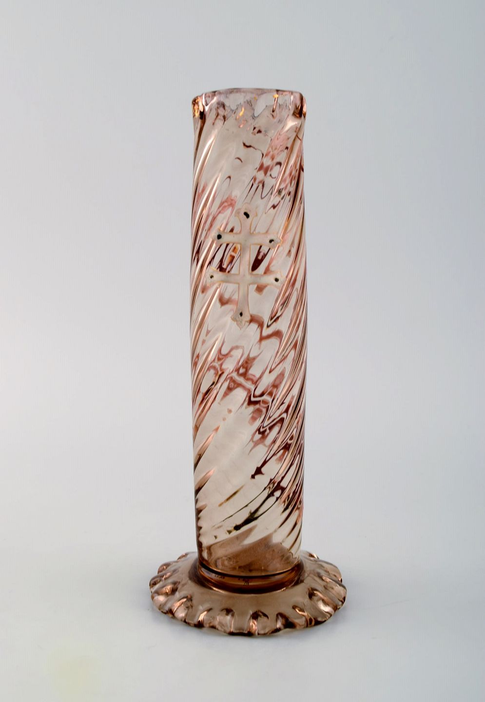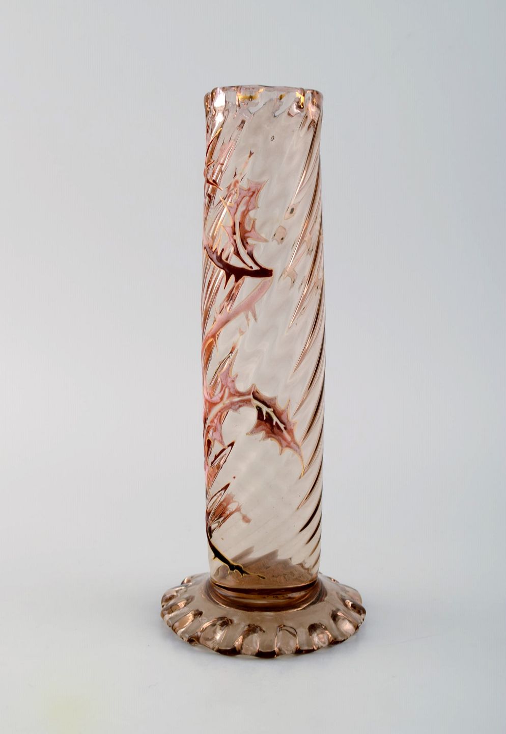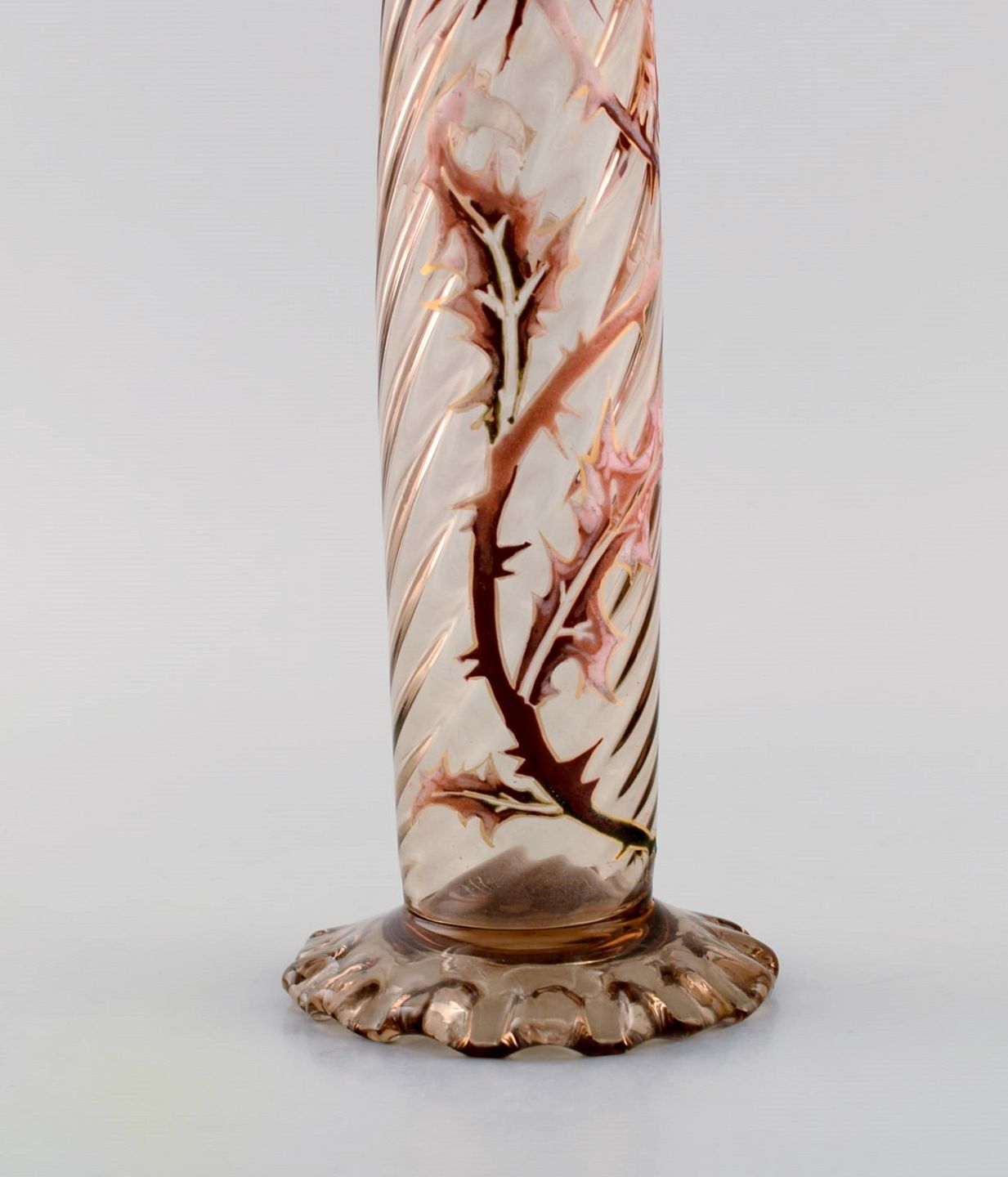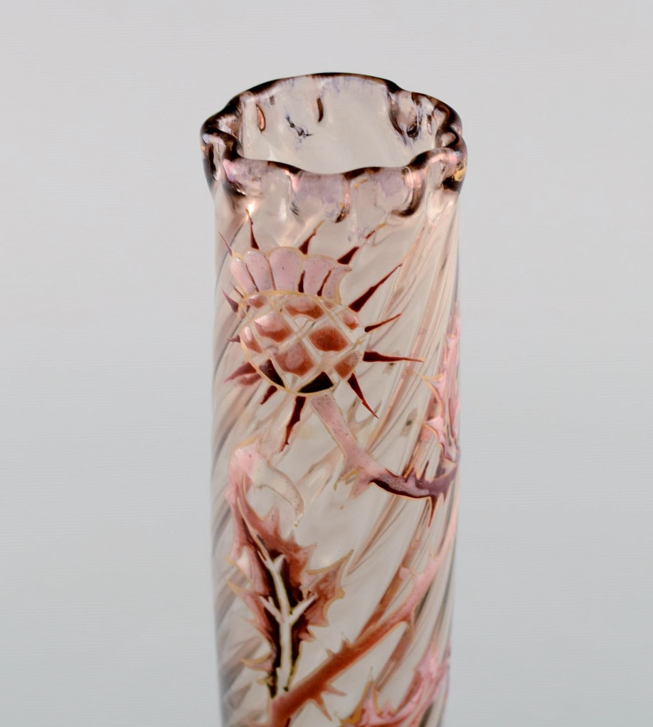 Tidlig Emile Gallé vase i klart matteret kunstglas. Overfang udskåret med motiver i form af blomster og blade. Kantet bund og munding. Emaljearbejde og forgyldt. Museumskvaliet. Ca. 1885.