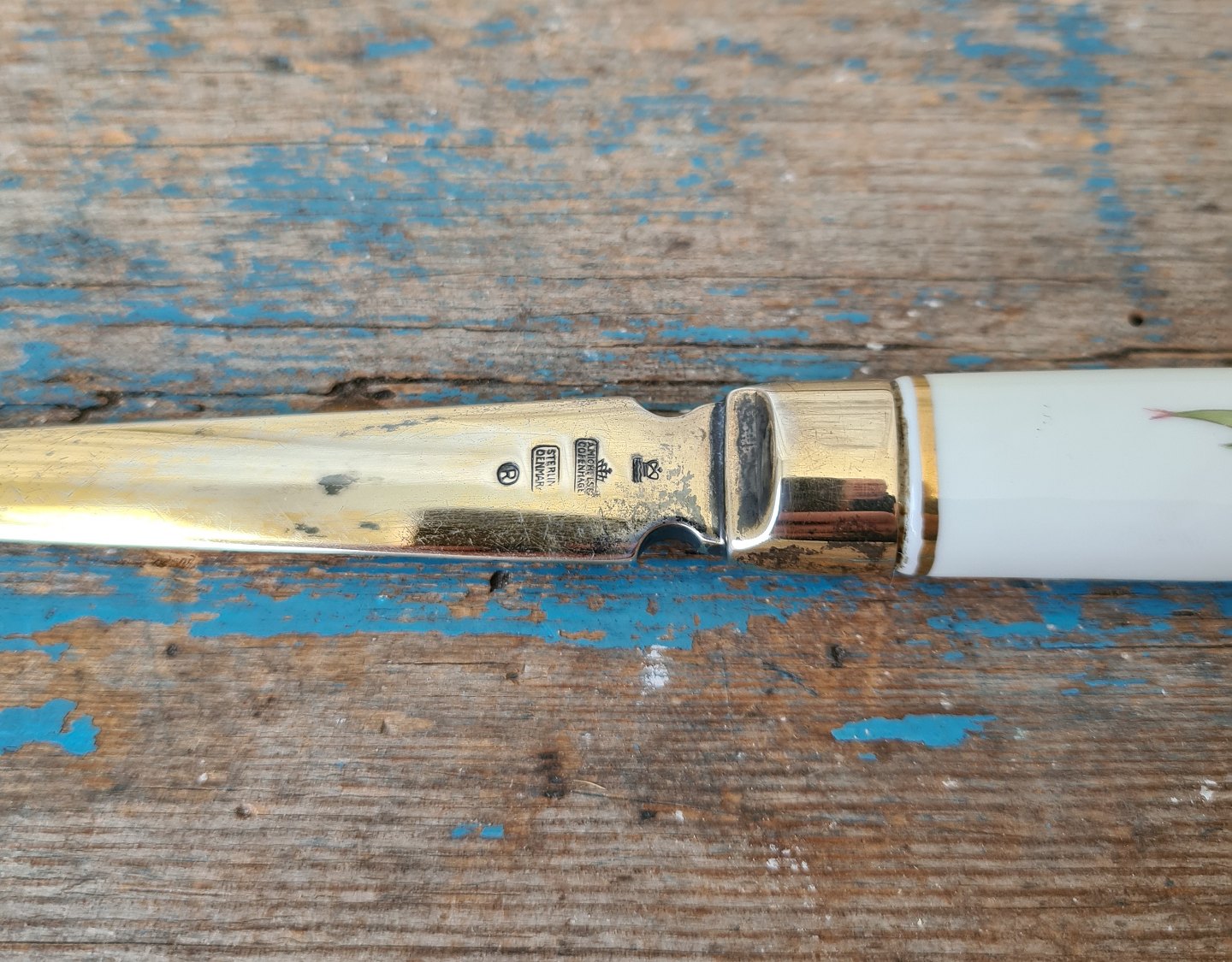 Royal Copenhagen - A.Michelsen Flora Danica brevkniv i forgyldt sølv og porcelæn - dekoreret med storkenæb.