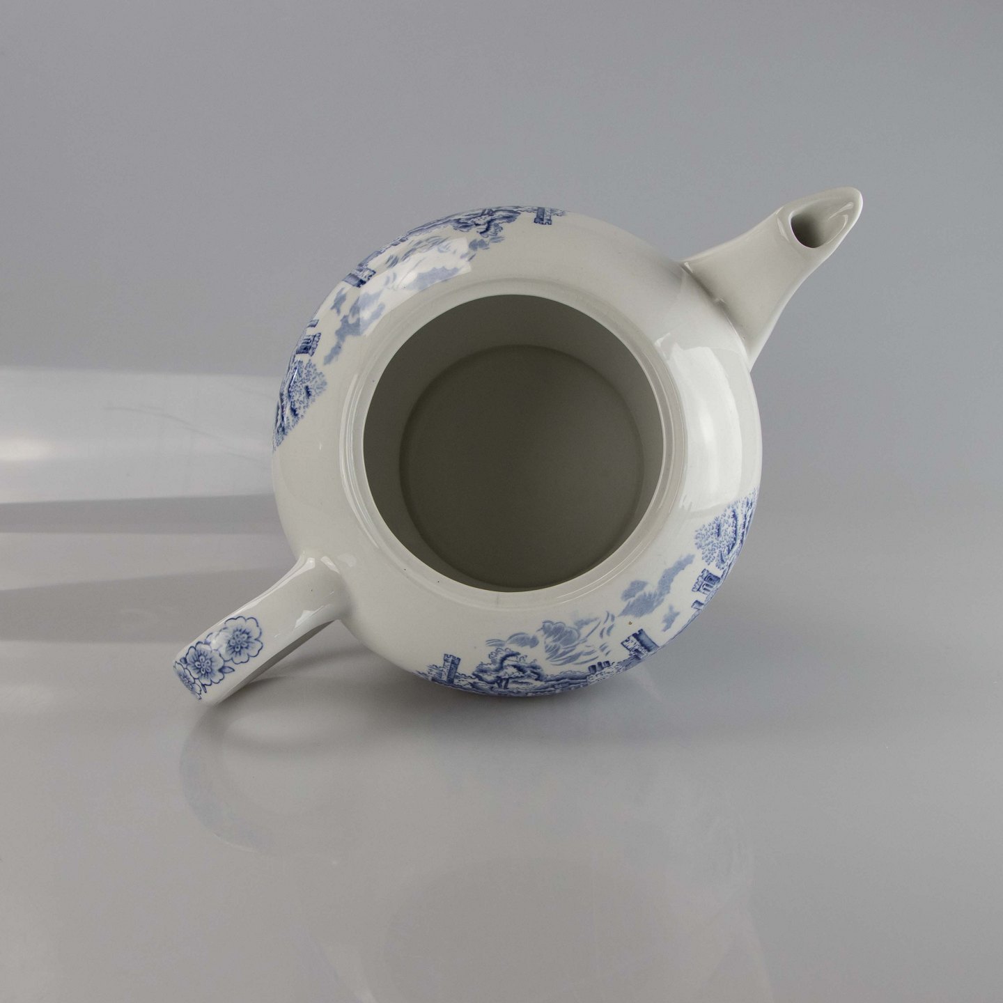 Tepotte i lys fajance med blådekoreret slotsmotiv.
