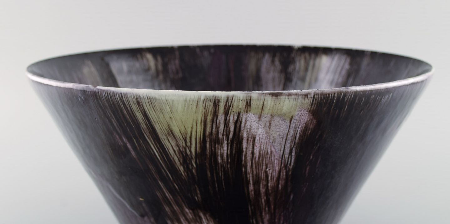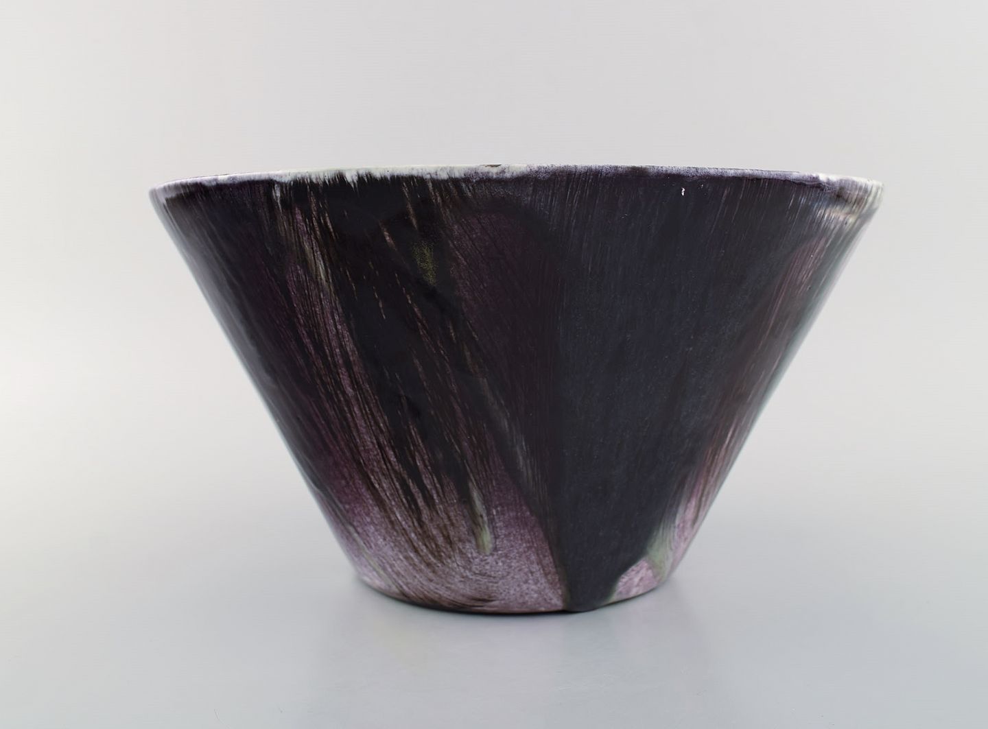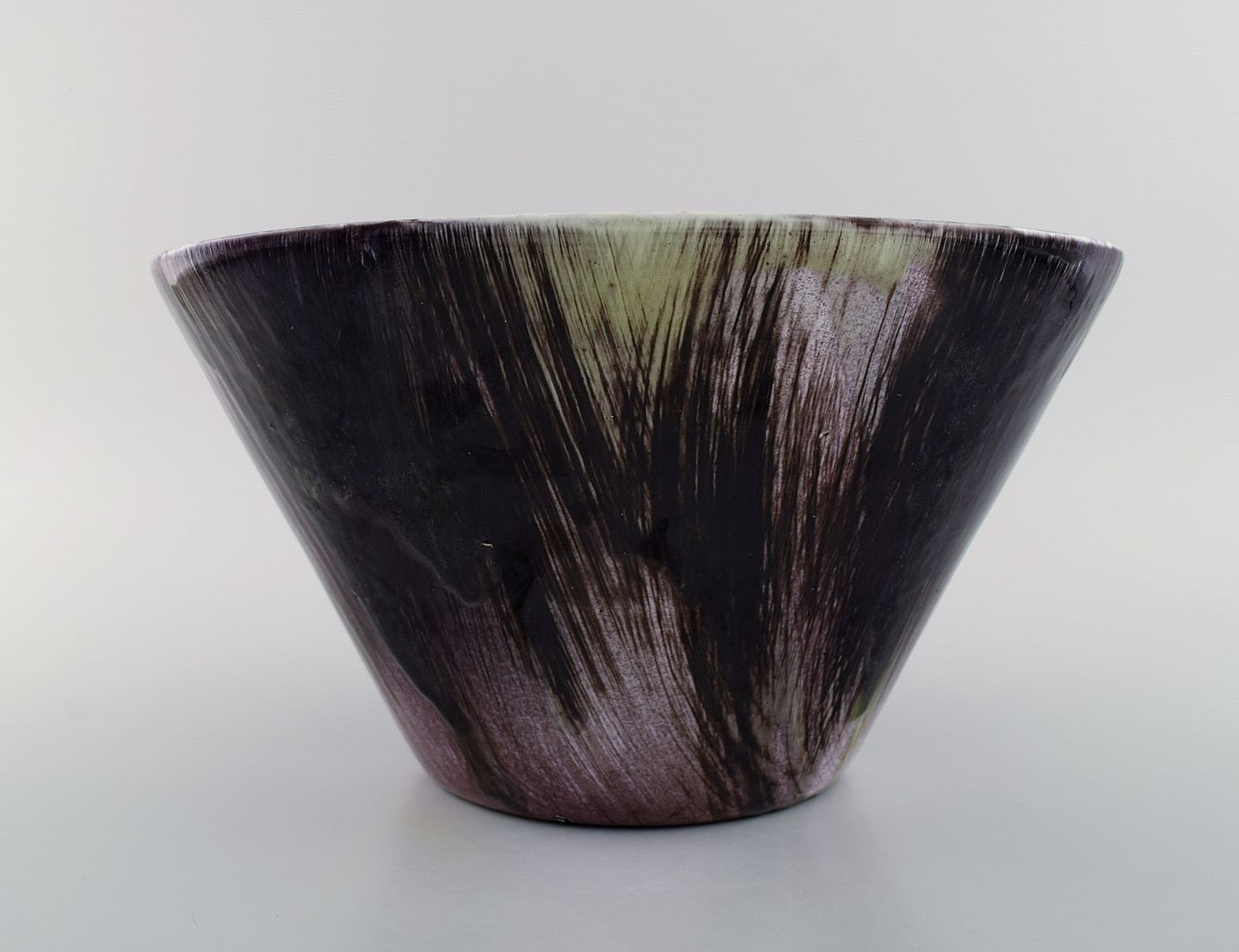 Mari Simmulson (1911-2000) for Upsala-Ekeby. Stor skål i håndmalet glaseret stentøj. Midt 1900-tallet.