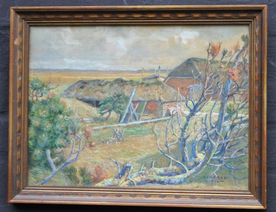Nyrop, Børge (1881 - 1948) Denmark: A farm by the North Sea. Watercolor / pastel on paper. Signed 1926. 25 x 35 cm. Framed: 31 x 40 cm.