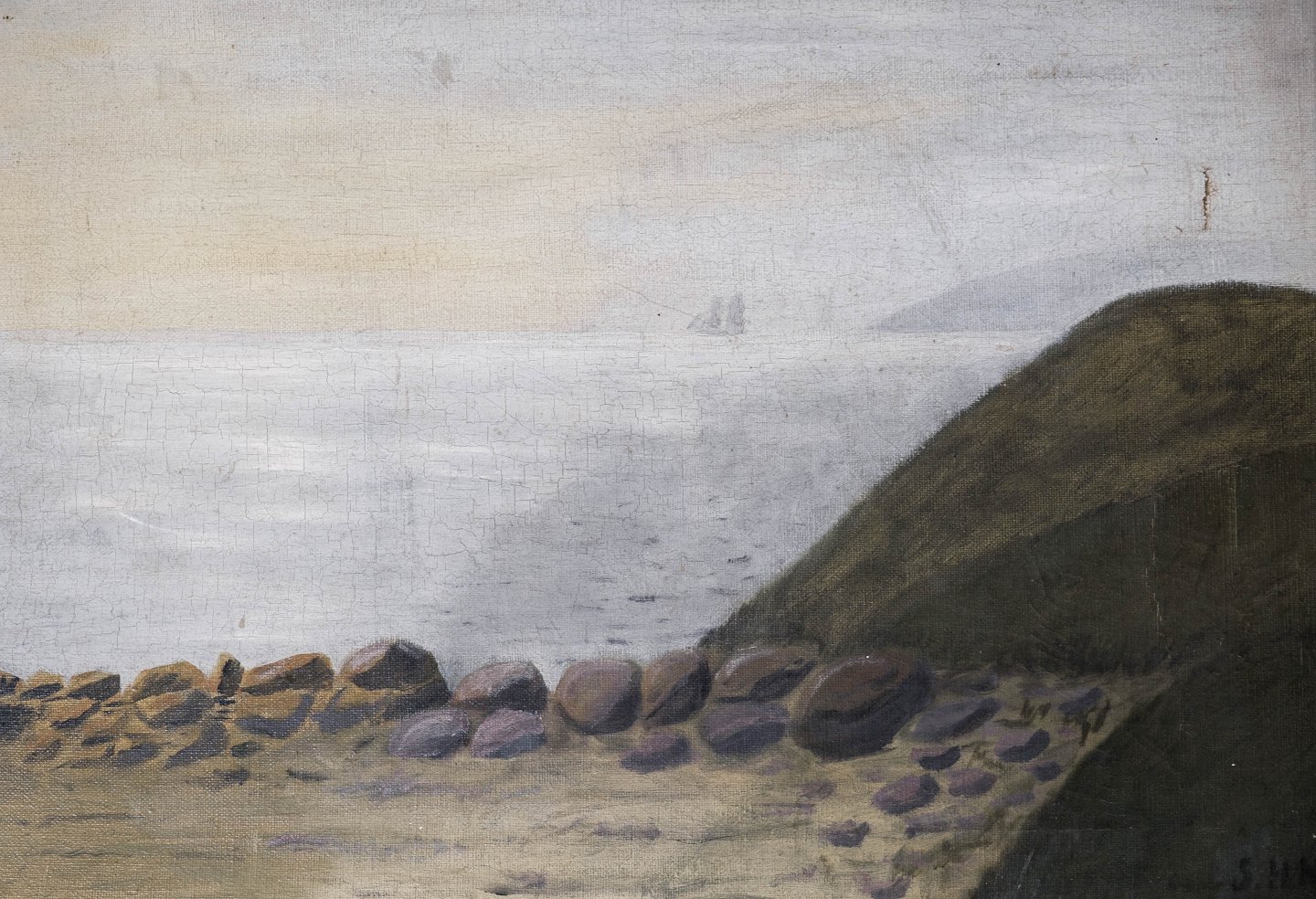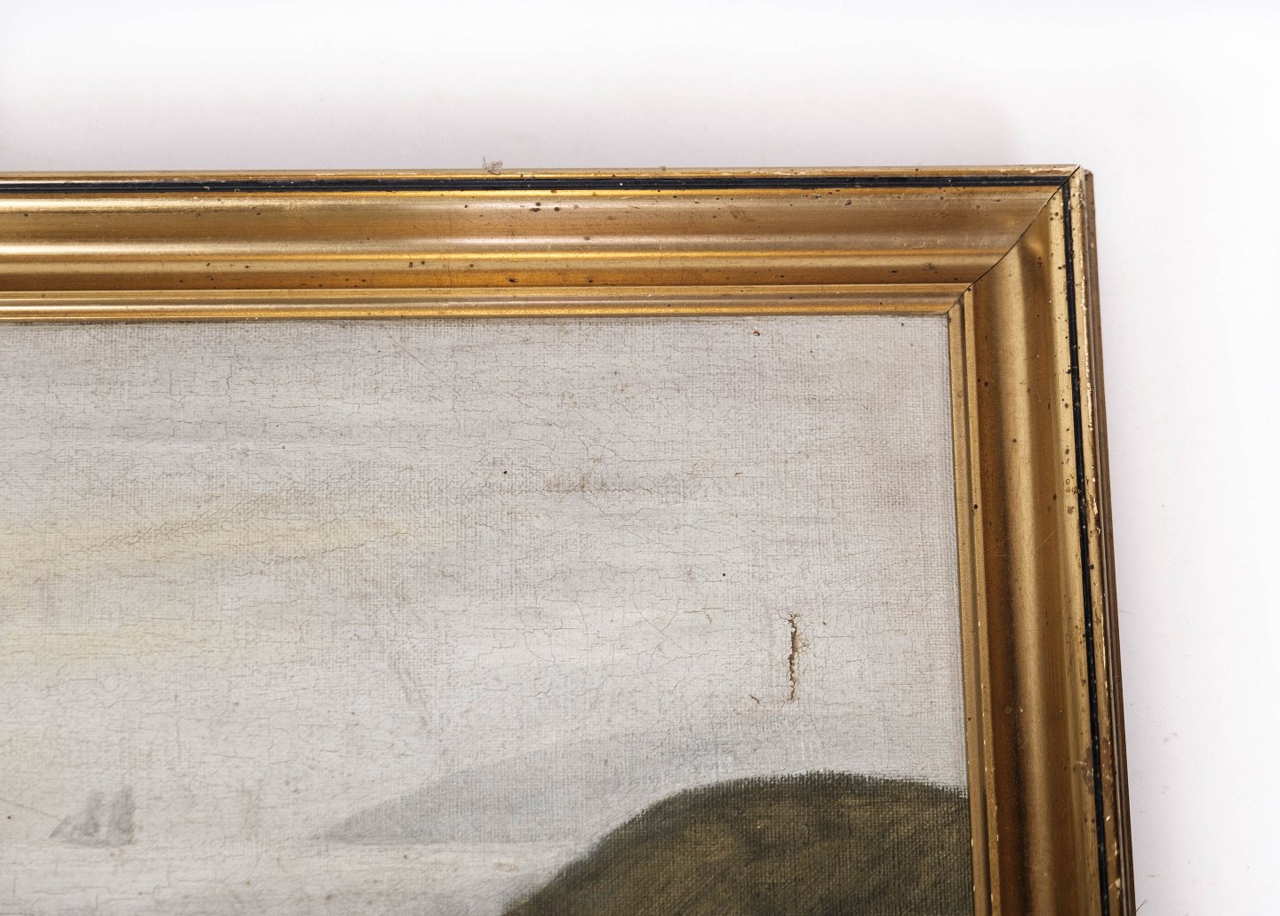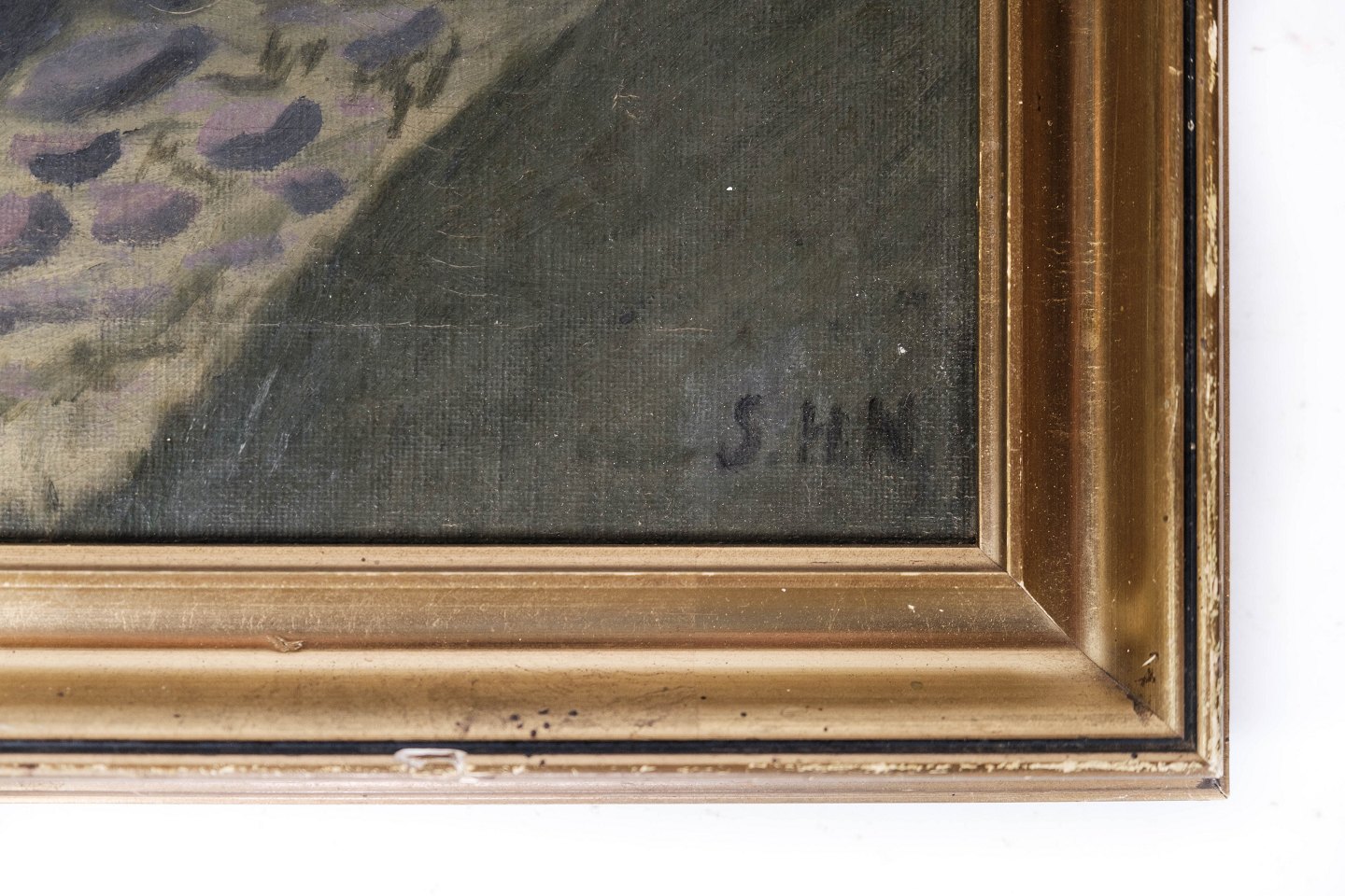 Maleri på lærred med natur motiv og forgyldt ramme, signeret S.H.N. fra 1920erne.