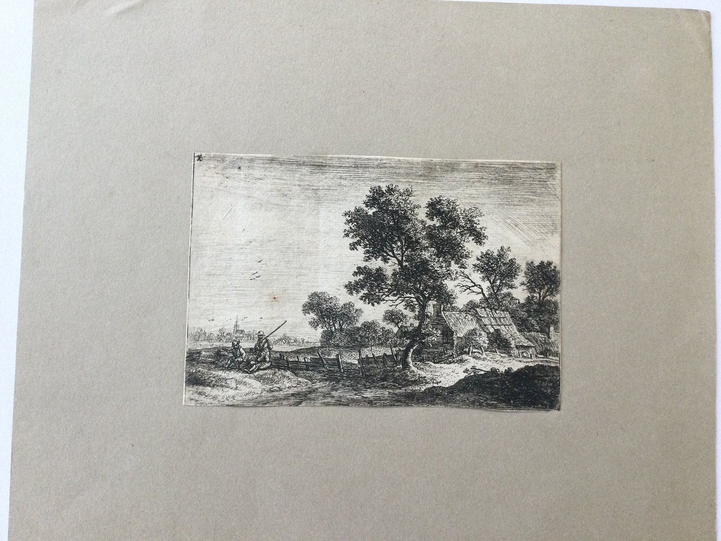 Kobberstik af Anthonie Waterloo - 3 bønder udenfor en landsby.
