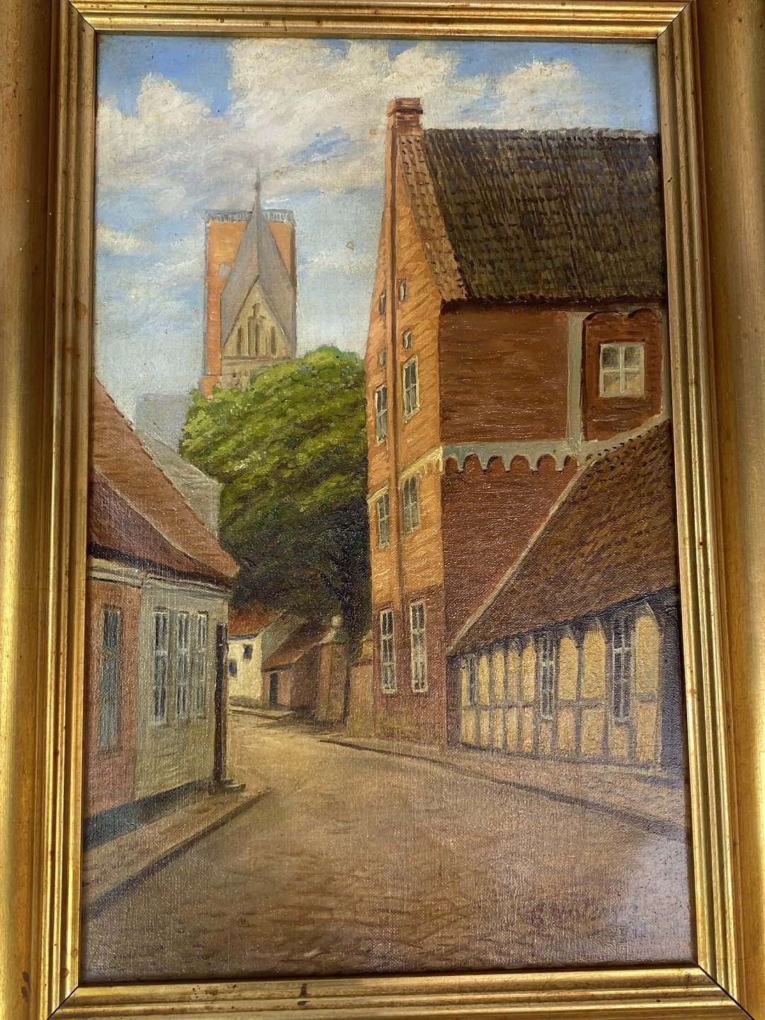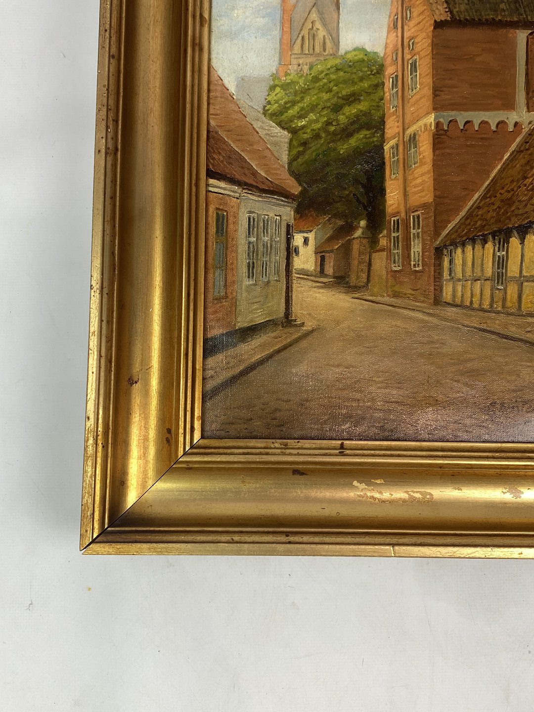 Maleri på lærred med bymotiv med ukendt signatur og forgyldt ramme, fra 1930erne.