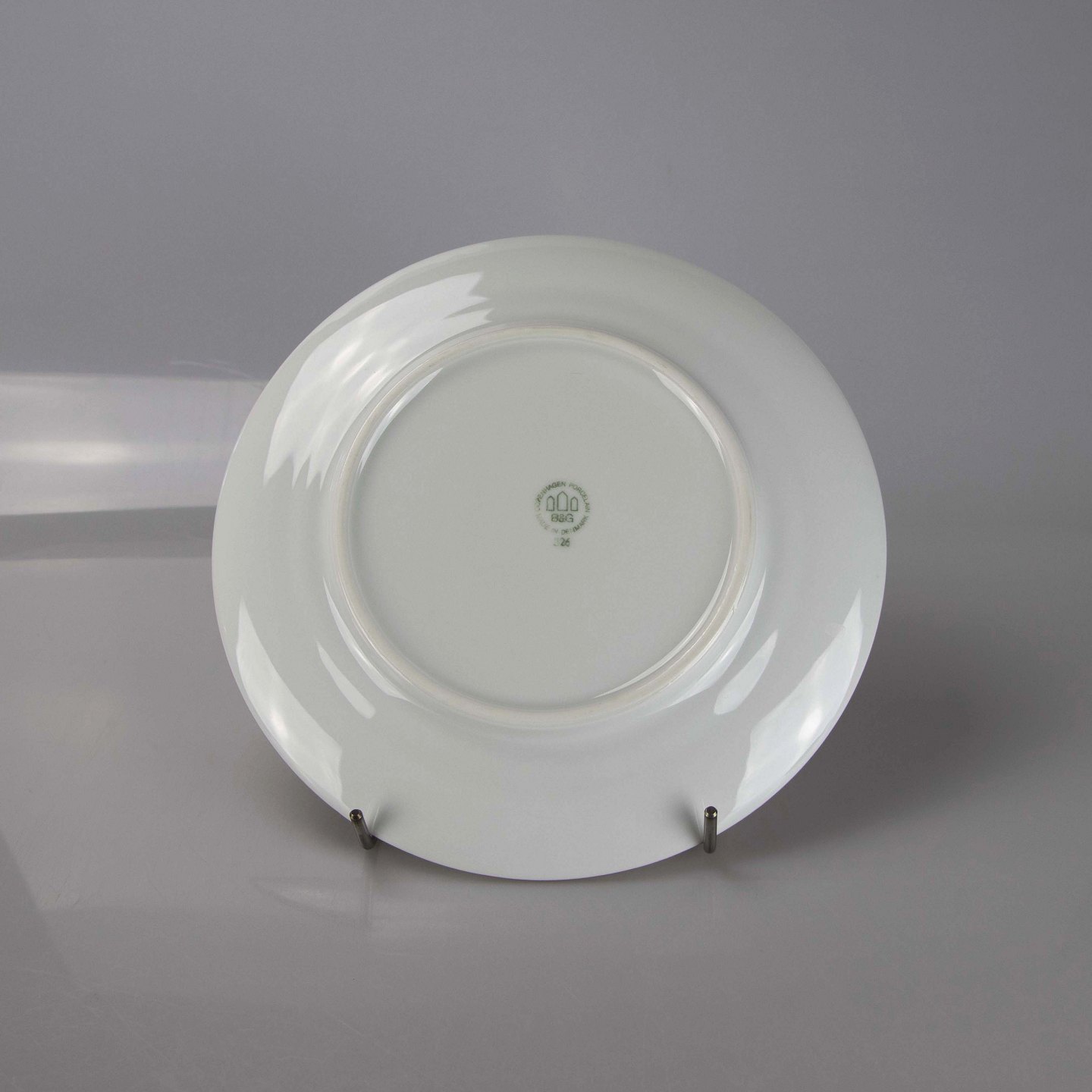 Tallerken fremstillet i hvidt porcelæn med gylden buet bord og grøn streg.