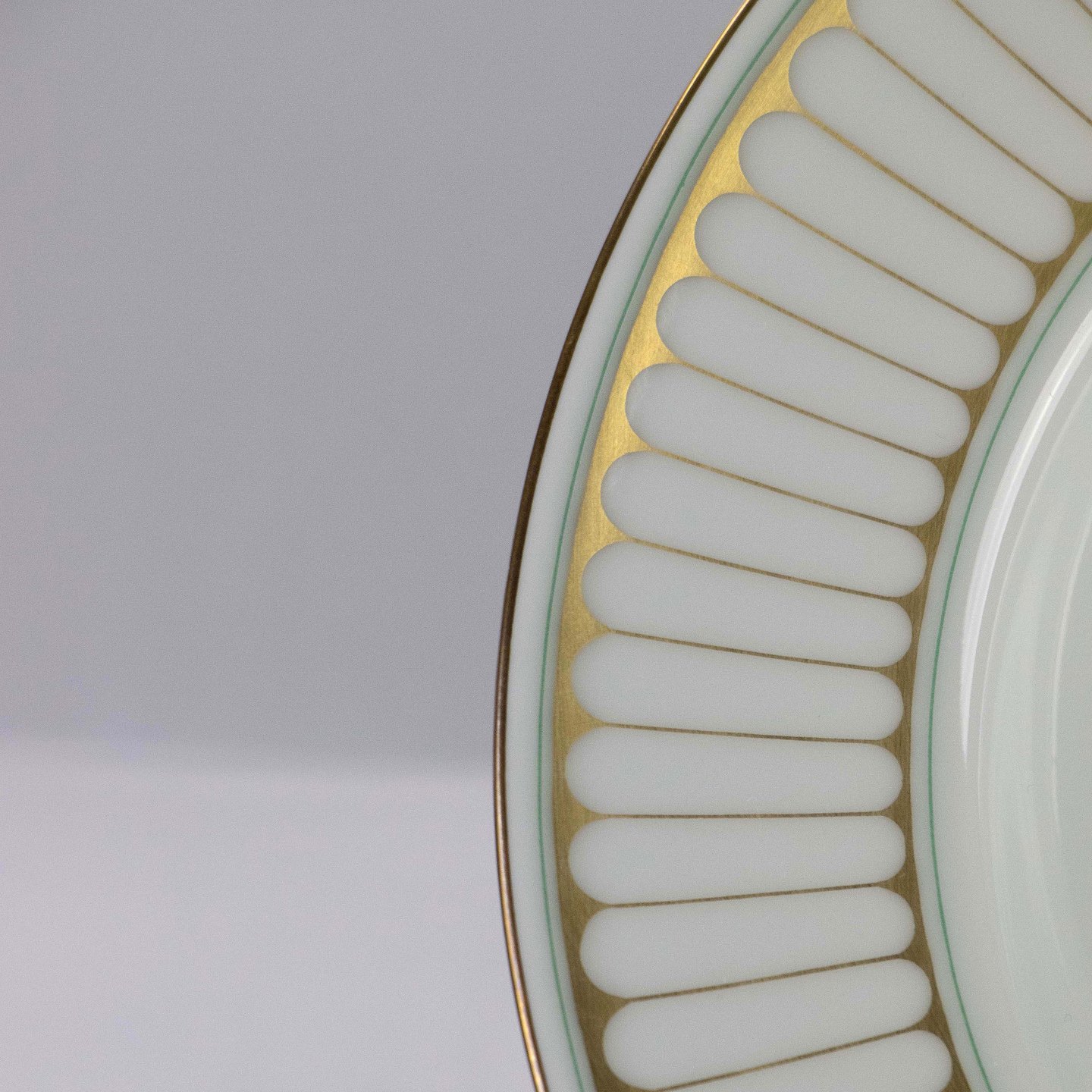 Tallerken fremstillet i hvidt porcelæn med gylden buet bord og grøn streg.