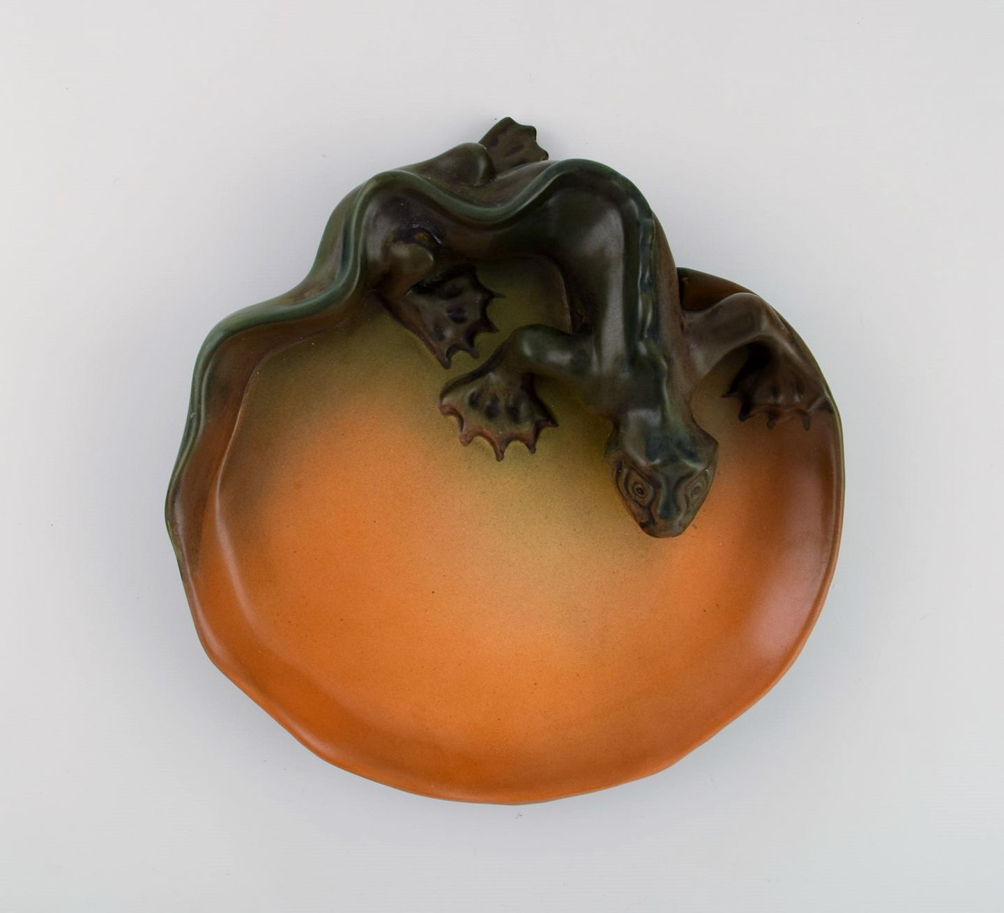 Ipsens enke, Danmark. Sjældent fad i håndmalet glaseret keramik modelleret med øgle. 1920'erne. Modelnummer 138.