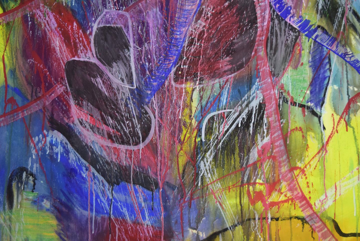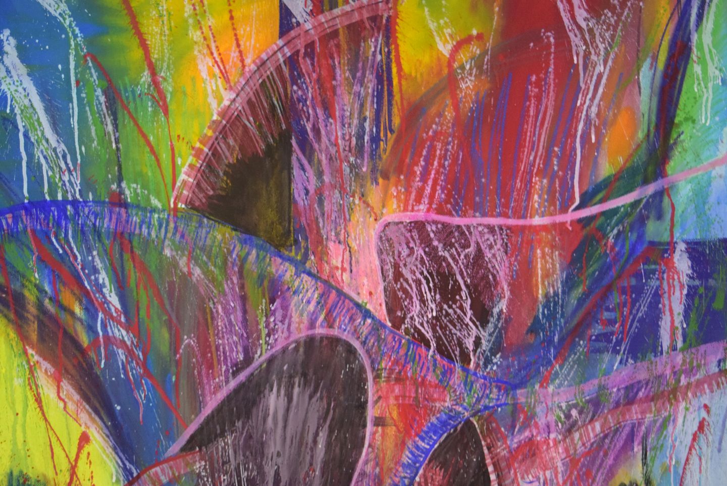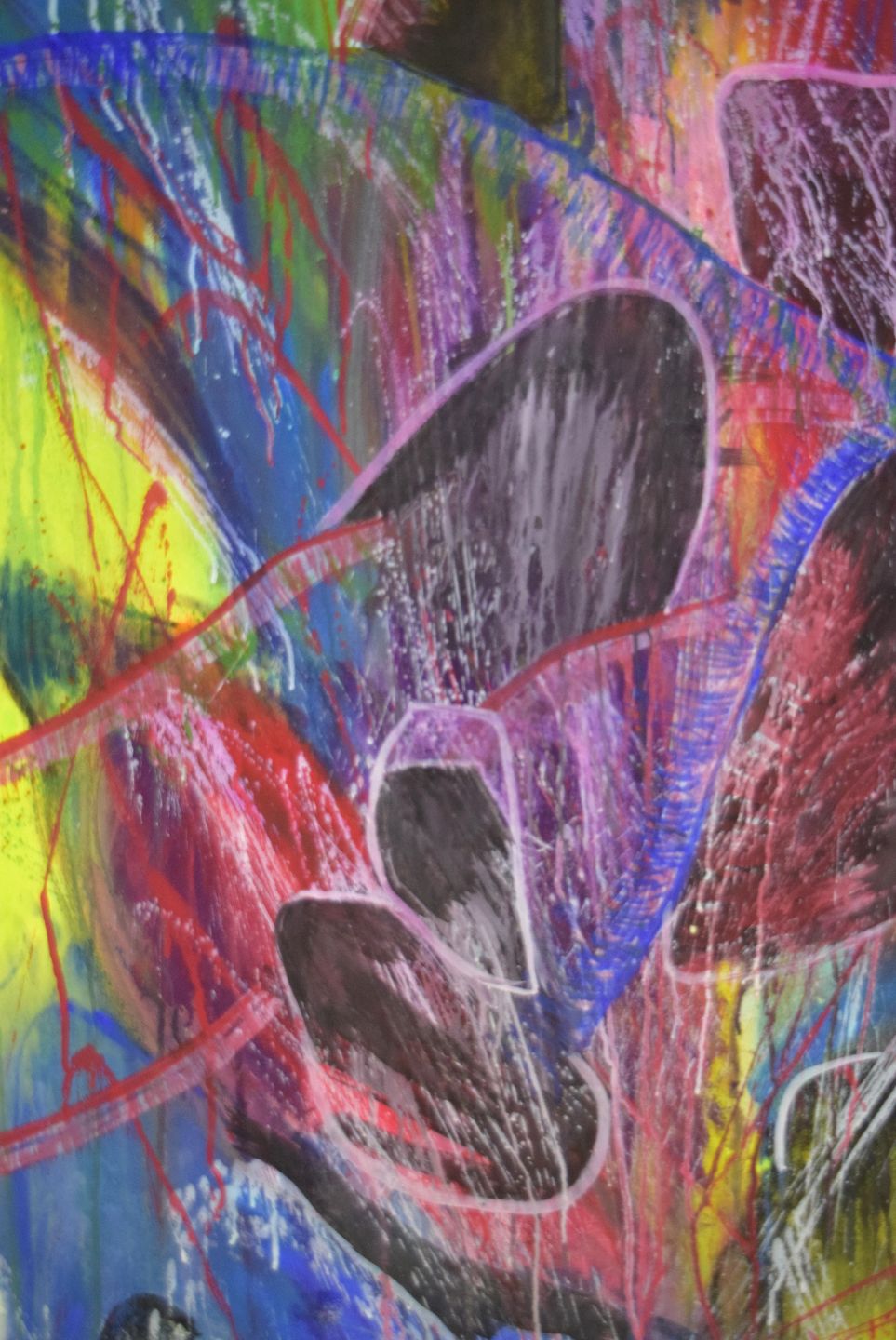 Ivy Lysdal, f 1937. Dansk keramiker og kunstmaler. Mixed media på karton. Stort abstrakt modernistisk maleri. Koloristisk palette. Sent 1900-tallet.