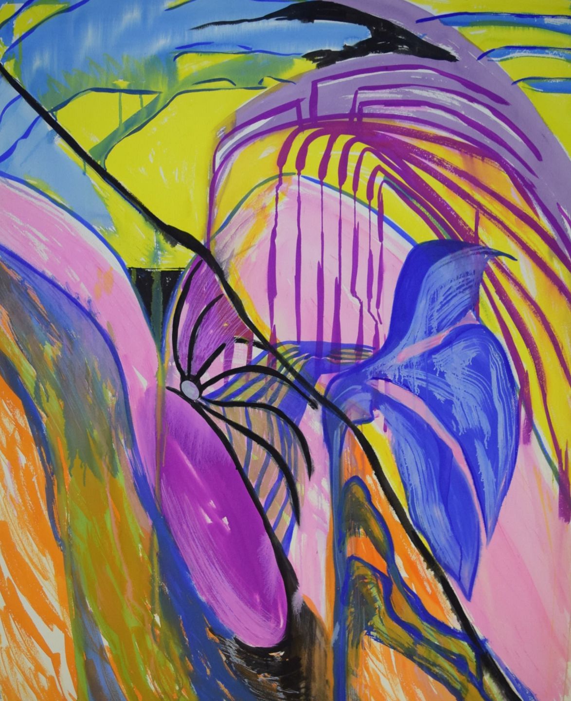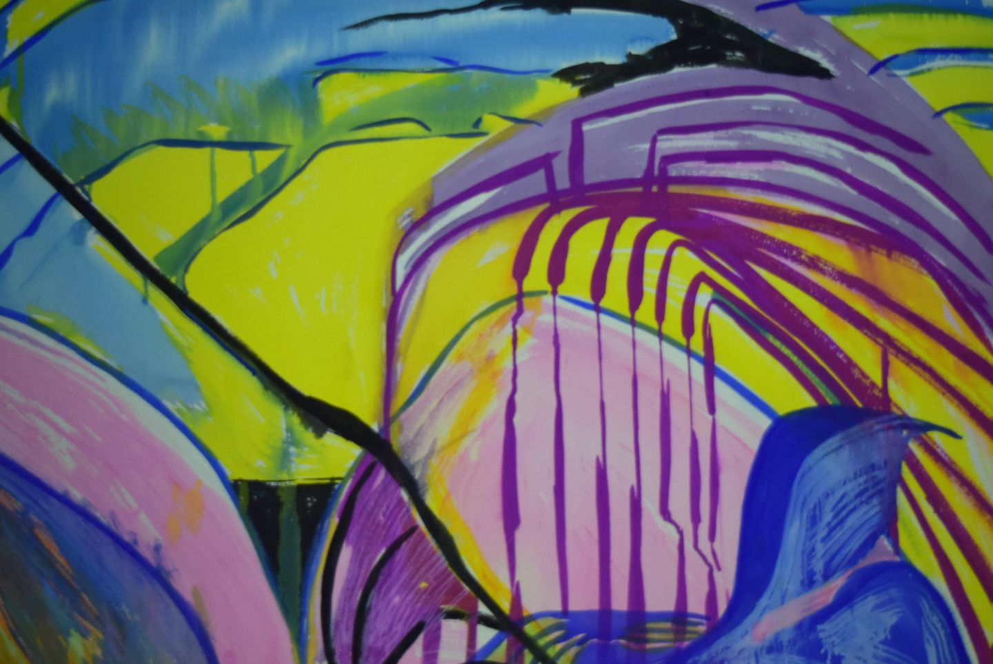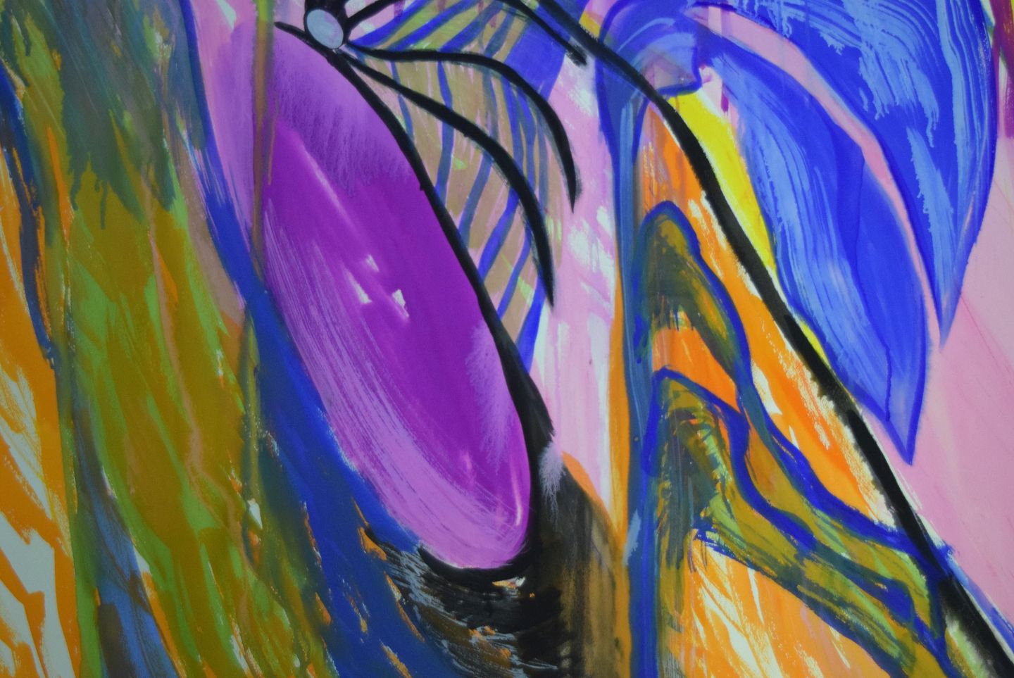 Ivy Lysdal, f 1937. Dansk keramiker og kunstmaler. Mixed media på karton. Stort abstrakt modernistisk maleri. Koloristisk palette. Sent 1900-tallet.