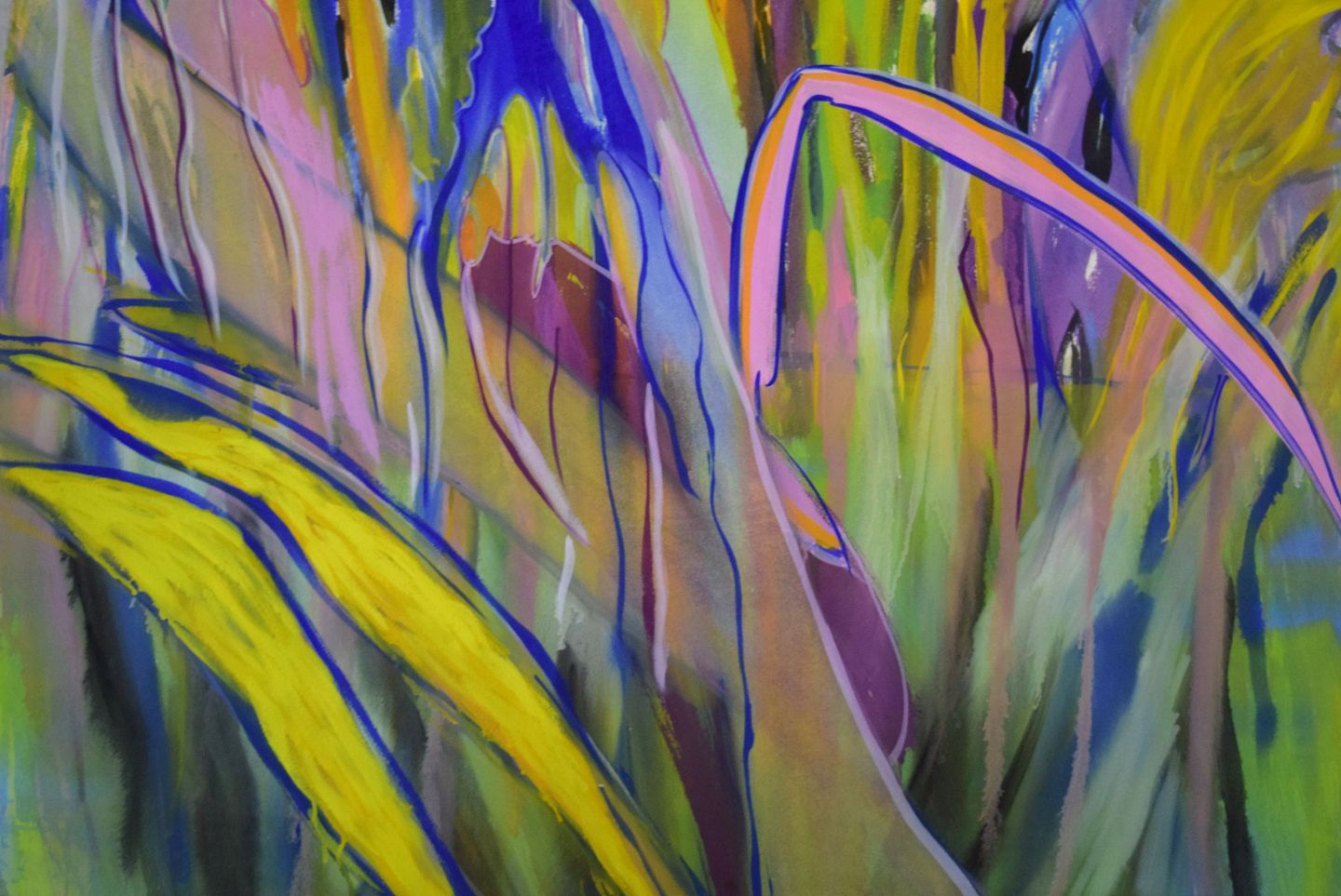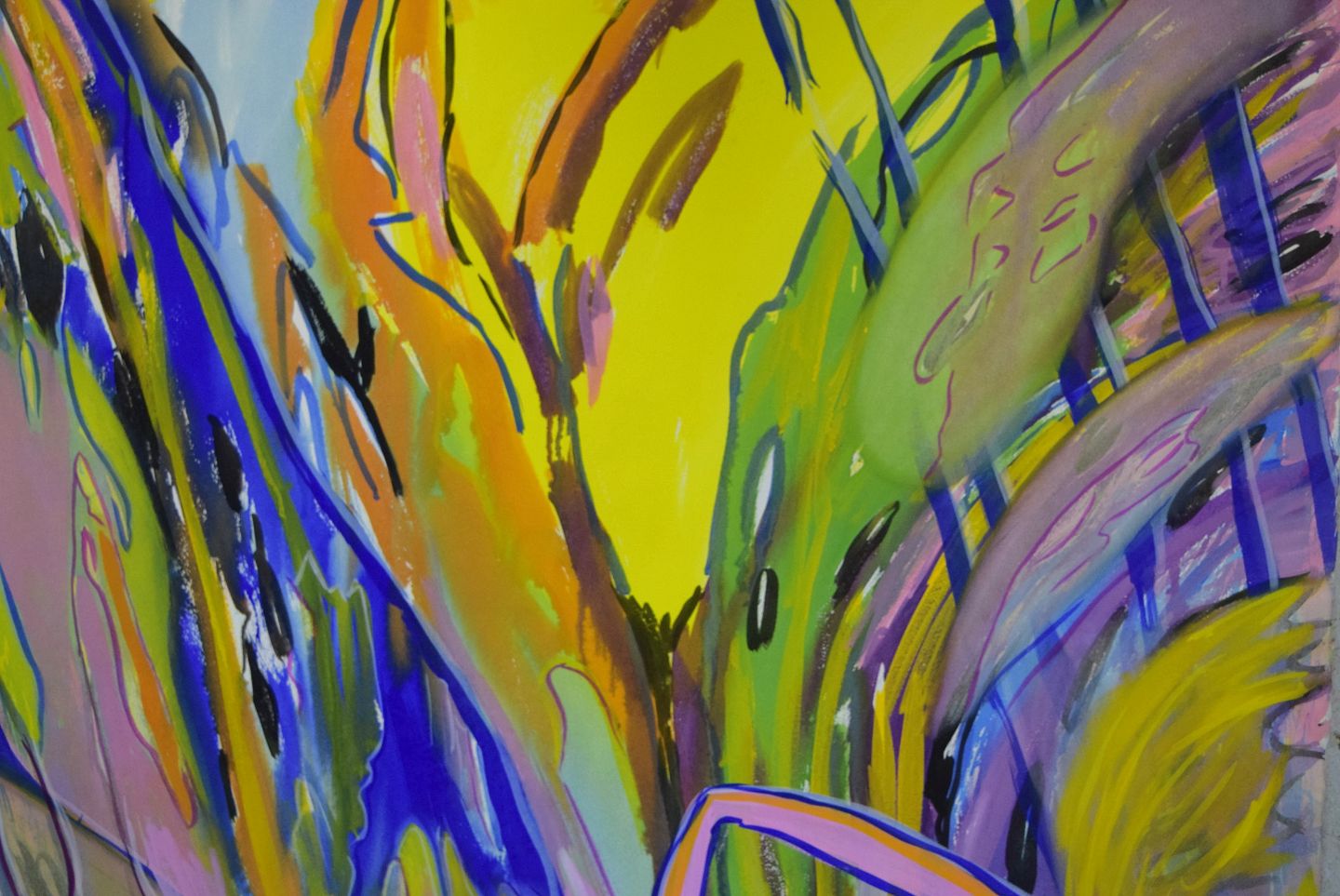 Ivy Lysdal, f 1937. Dansk keramiker og kunstmaler. Mixed media på karton. Stort abstrakt modernistisk maleri. Koloristisk palette. Sent 1900-tallet.