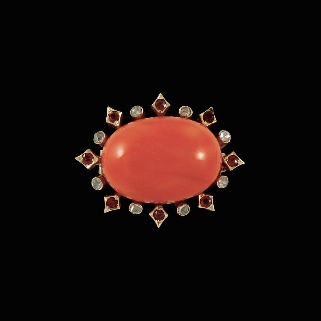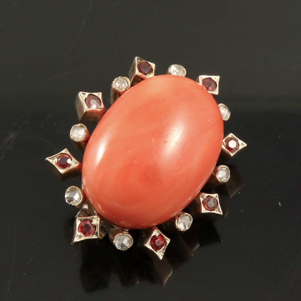 Broche i 14k guld med koral, rubiner og diamanter. |