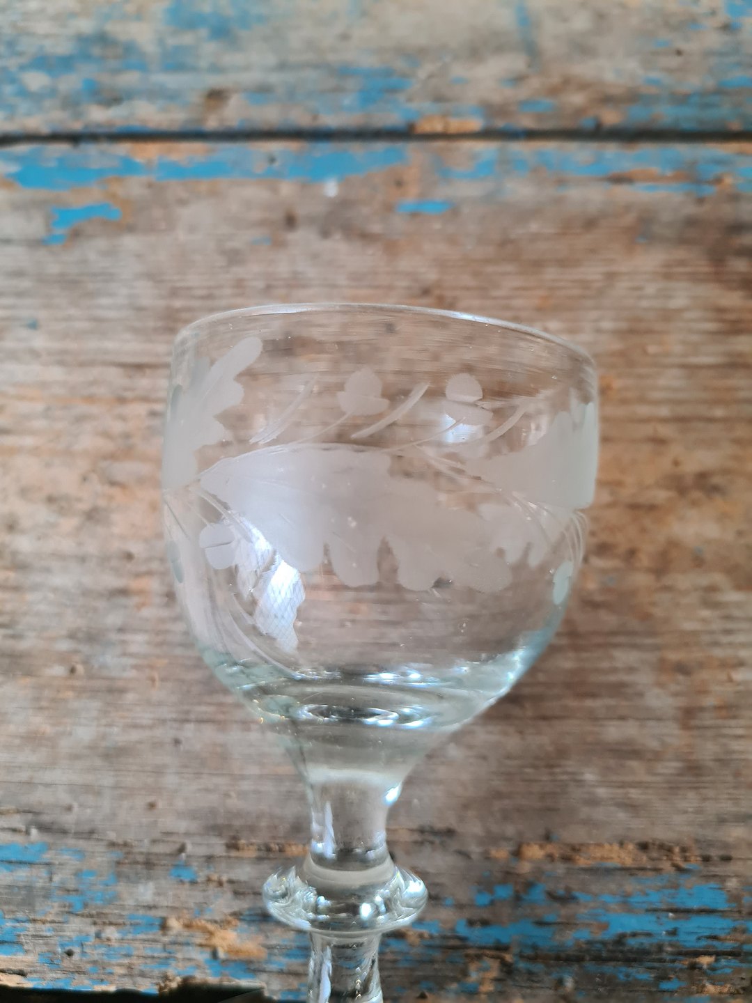 Vinglas på stilk med knap, dekoreret med matslebet egeløv med agern.