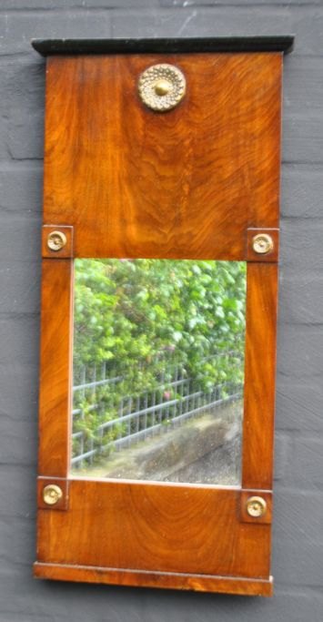Dansk empire spejl i poleret mahogni, ca. 1810. Med rosetter i messing. H.: 71,5 cm. B.: 33,7 cm.