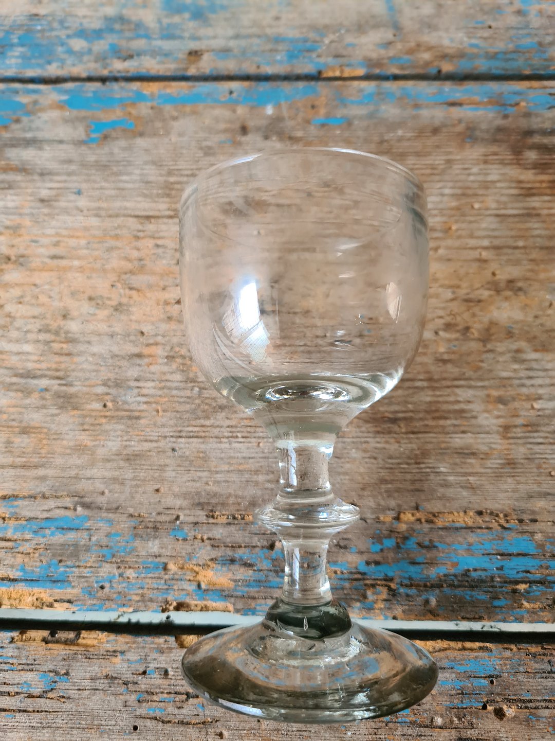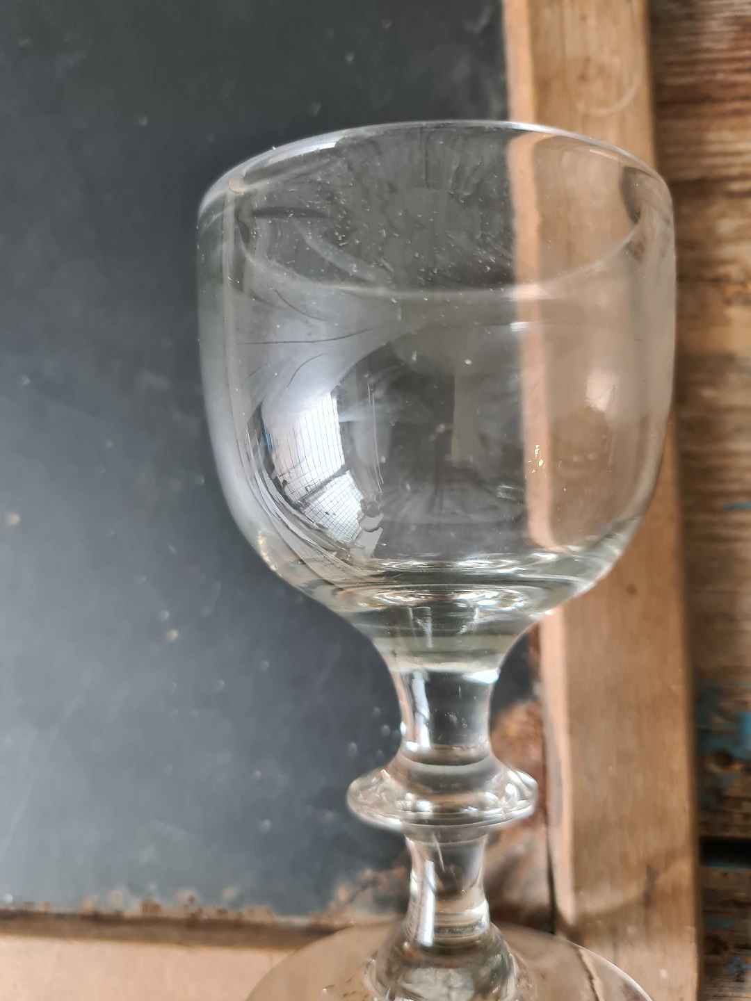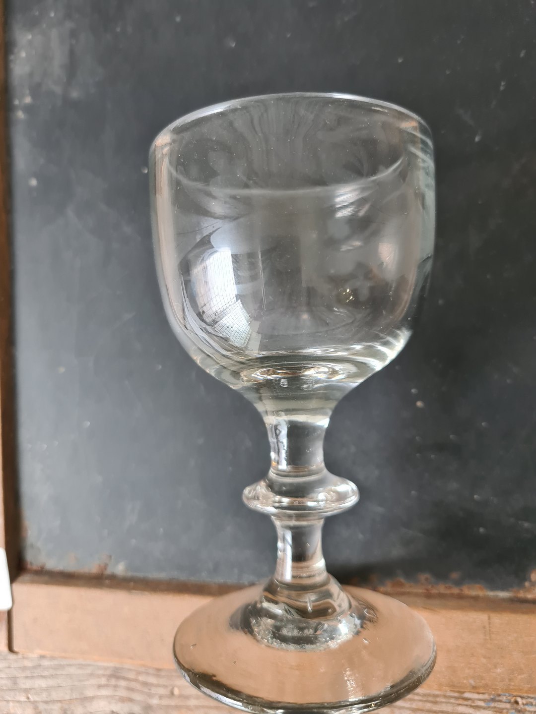 1800 tals vinglas på stilk med knap, kummen er bemalet med meget tynd hvid emalje dekoration i form af bladrane. Antageligt Mylenberg