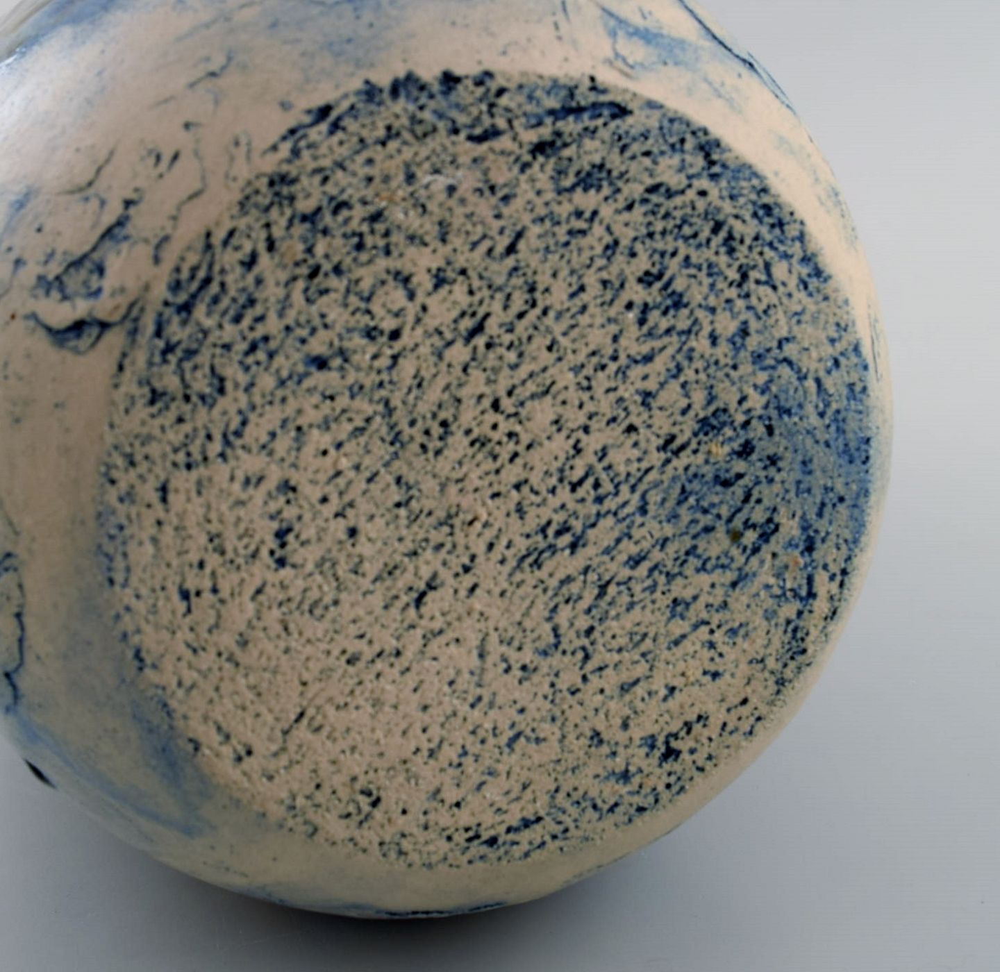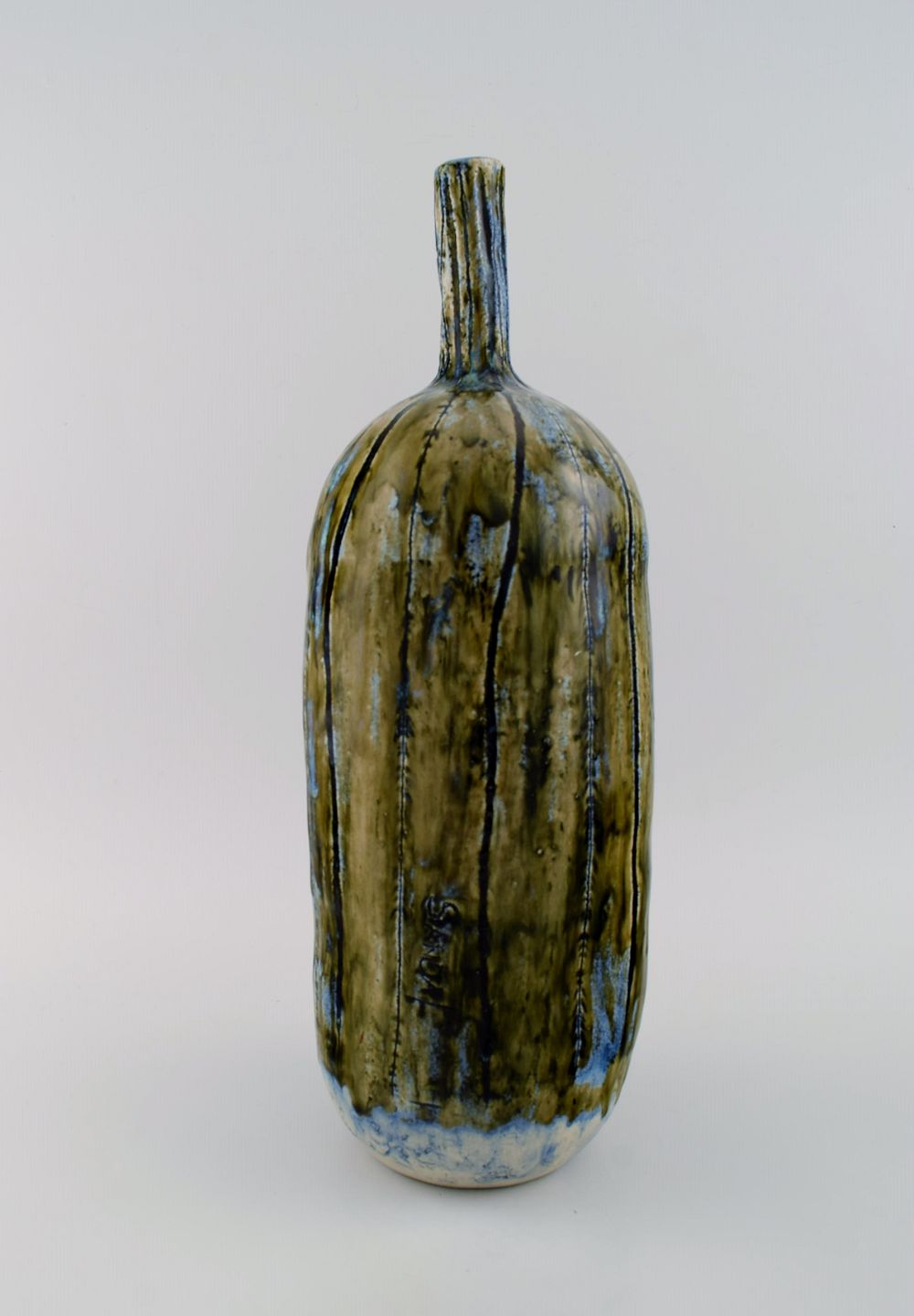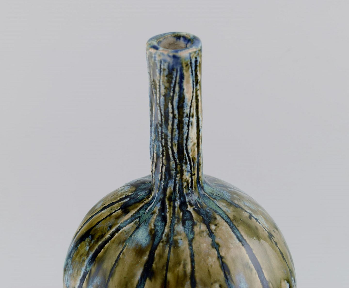 Dorte Sandal (f. 1955), Danmark. Stor unika vase i glaseret stentøj. Smuk glasur i blågrønne og lyse jordnuancer med indridsede vertikale linjer. 21. Århundrede.