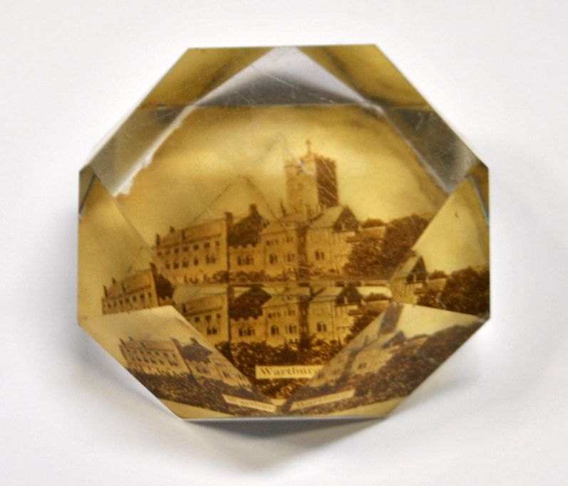 Glas brevpresse, ca. 1900, Tyskland. Med fotografi af Wartburg.