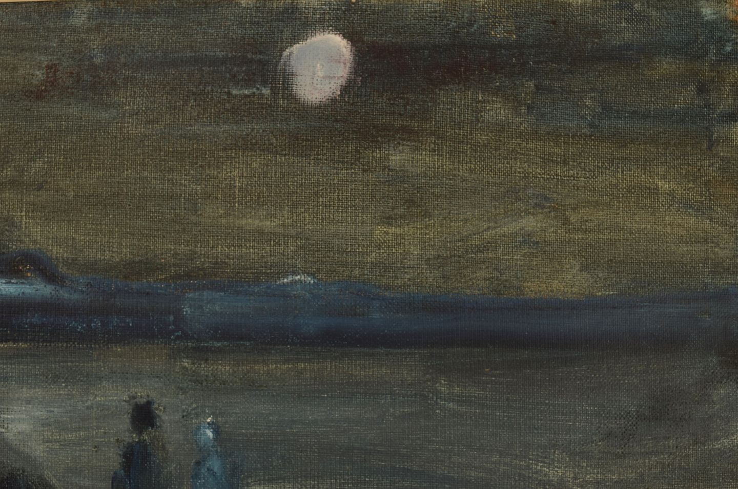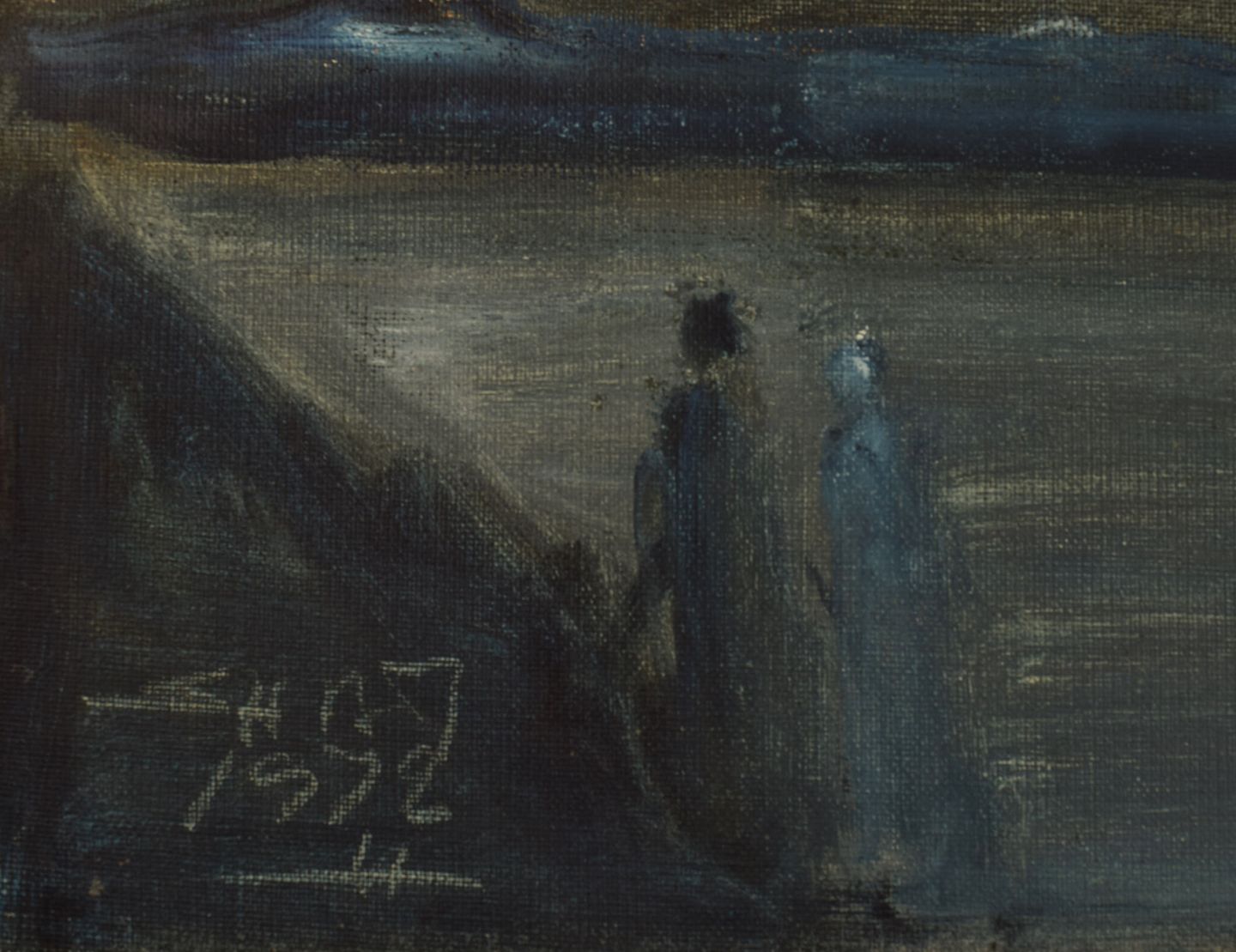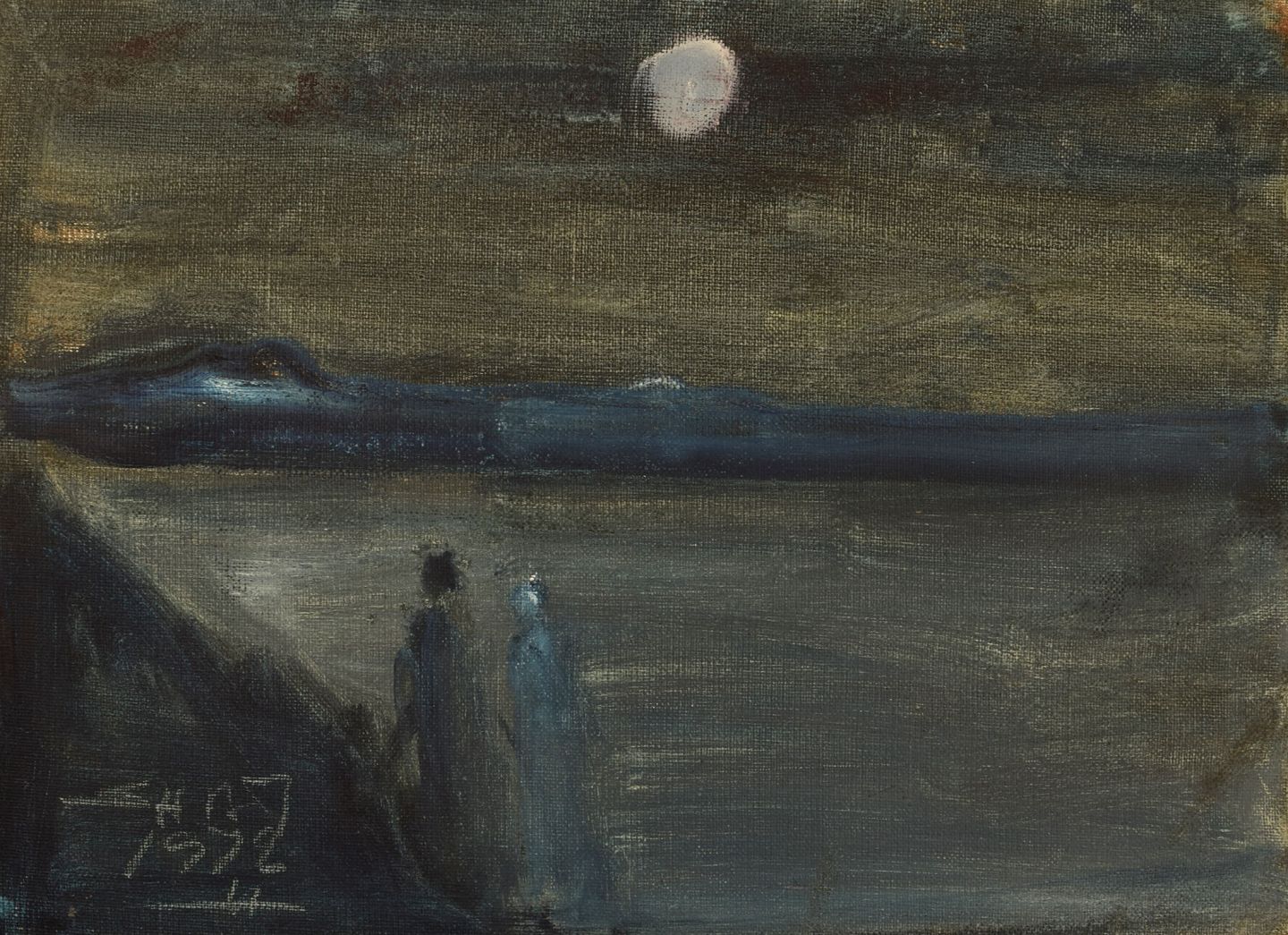 Svend Aage Tauscher (1911-1984), Dansk kunstner. Olie på lærred. Modernistisk landskab med par og måne i baggrunden. Dateret 1972.