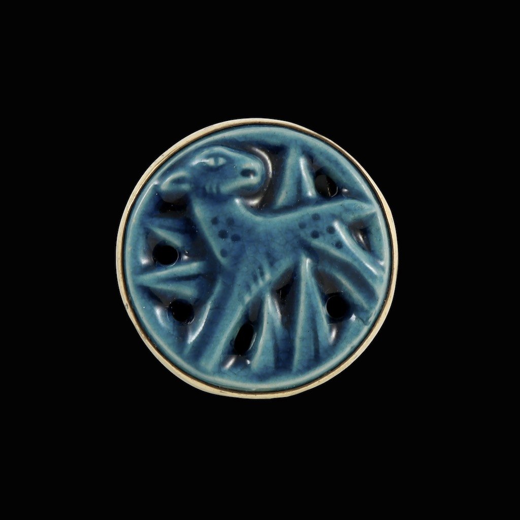 Jais Nielsen. Ceramic Brooch with blue glace and gilded silver mounting.